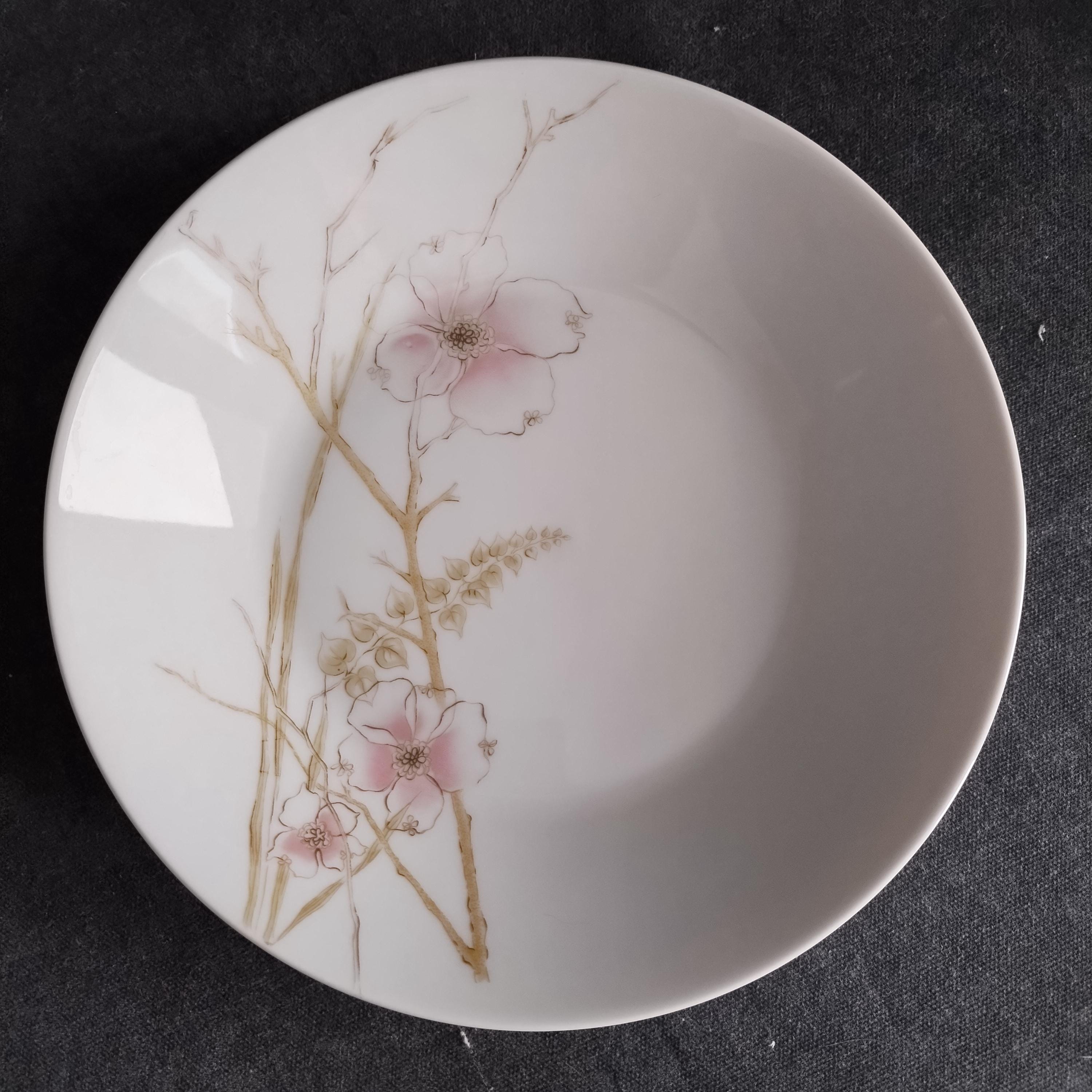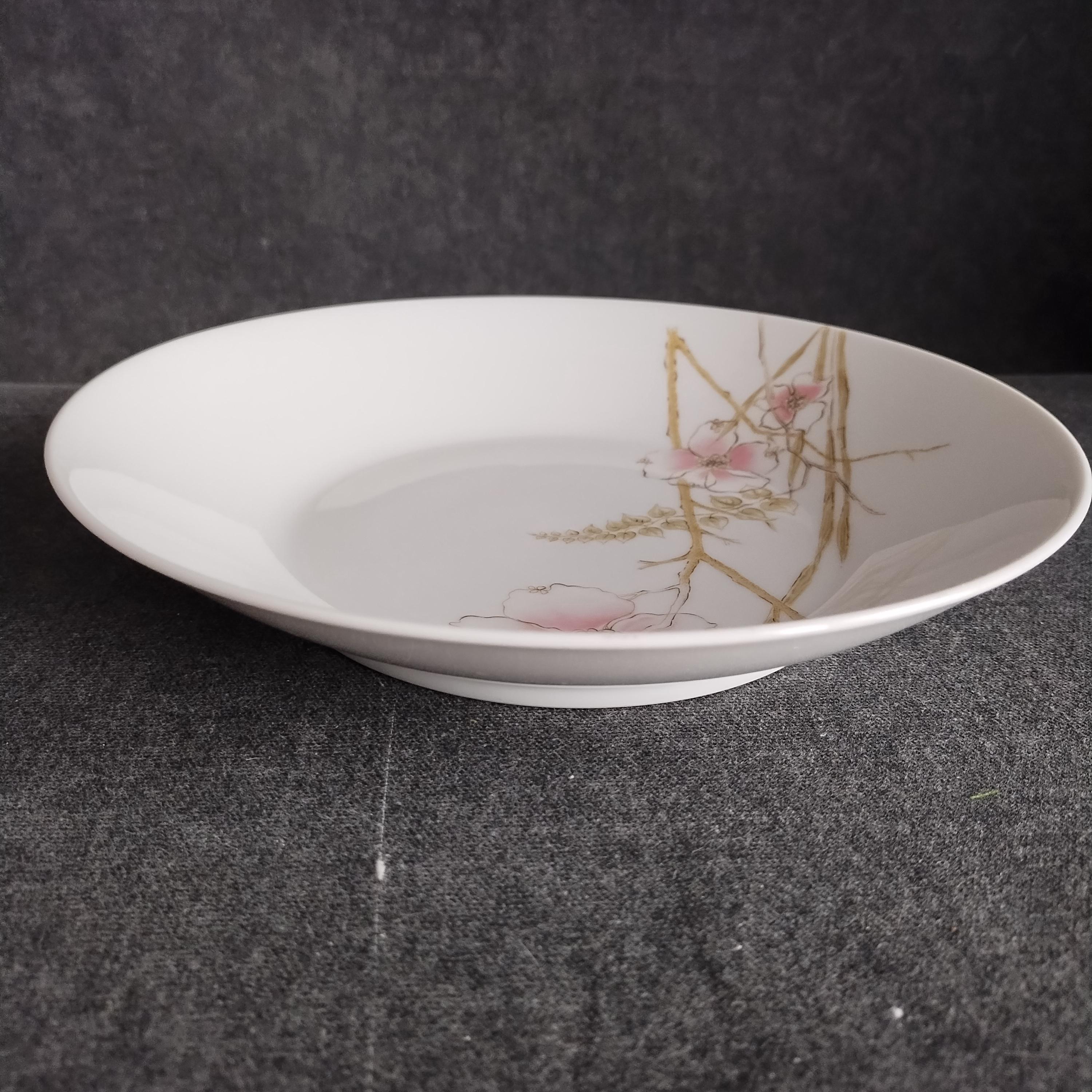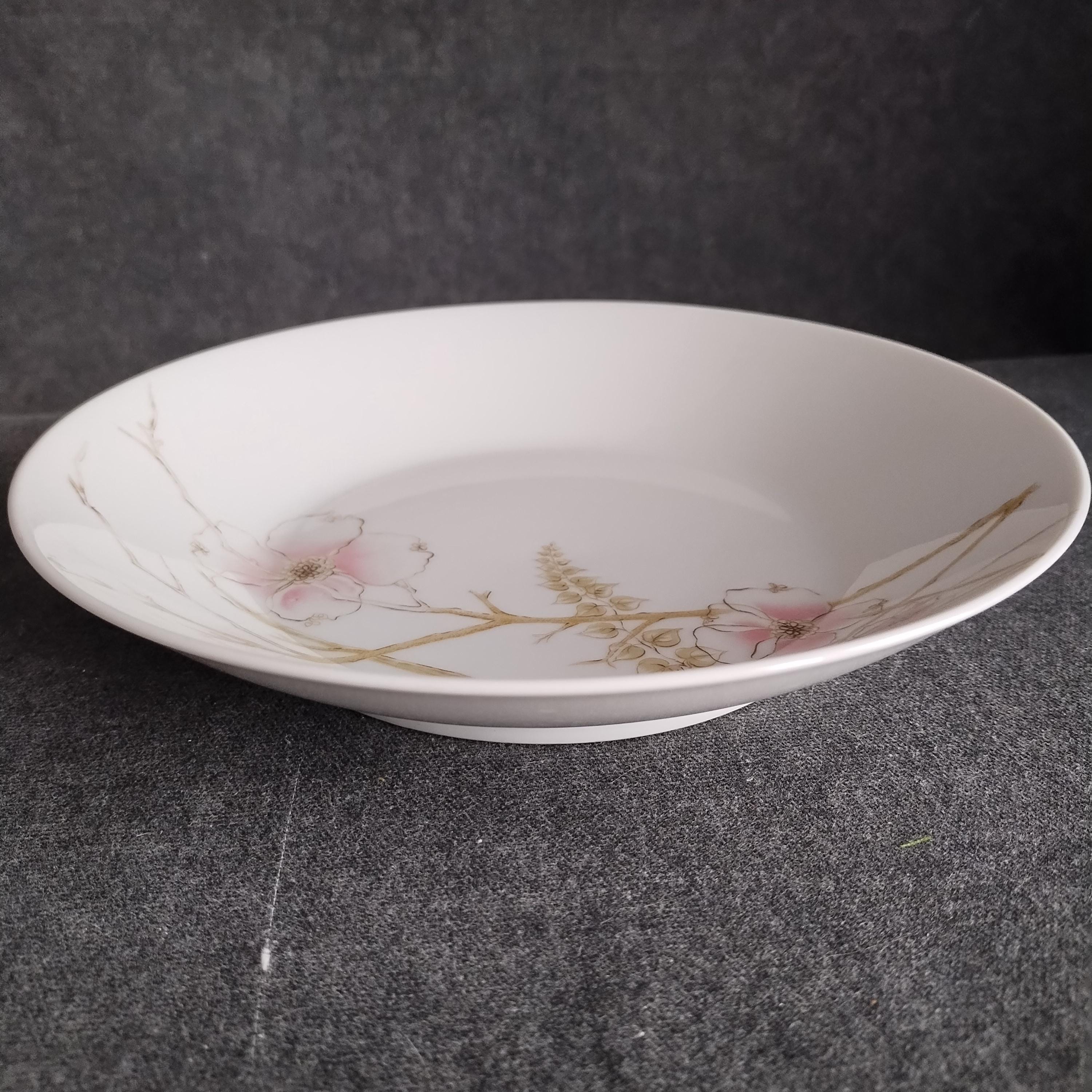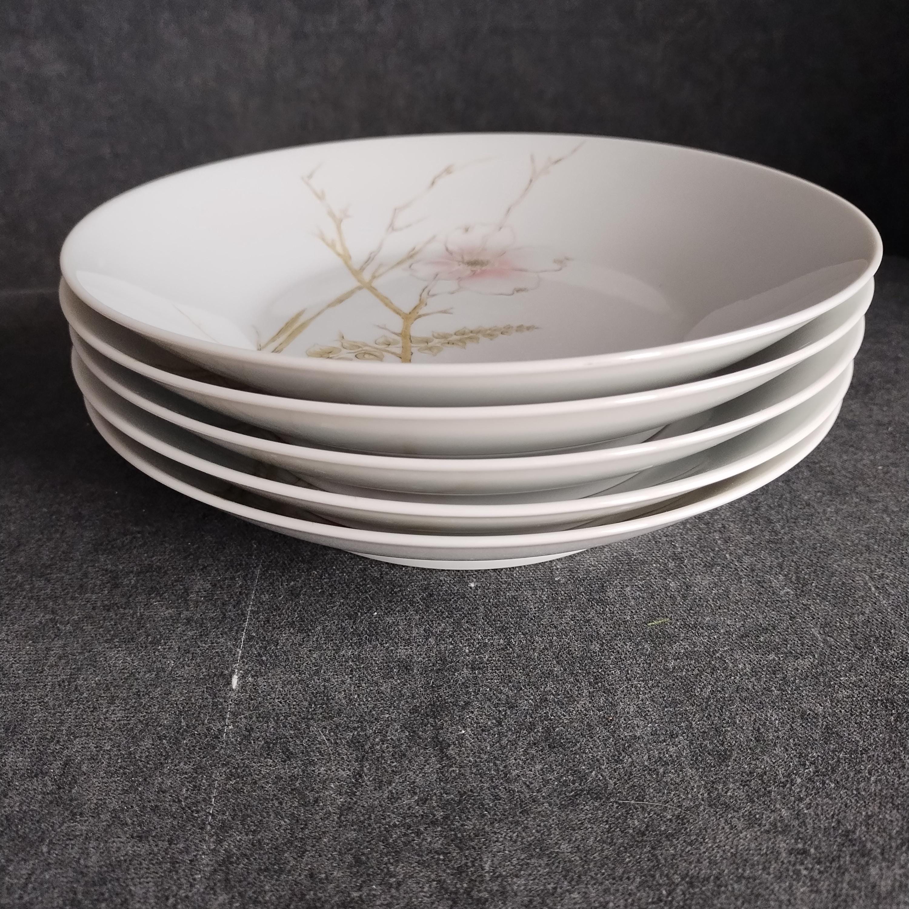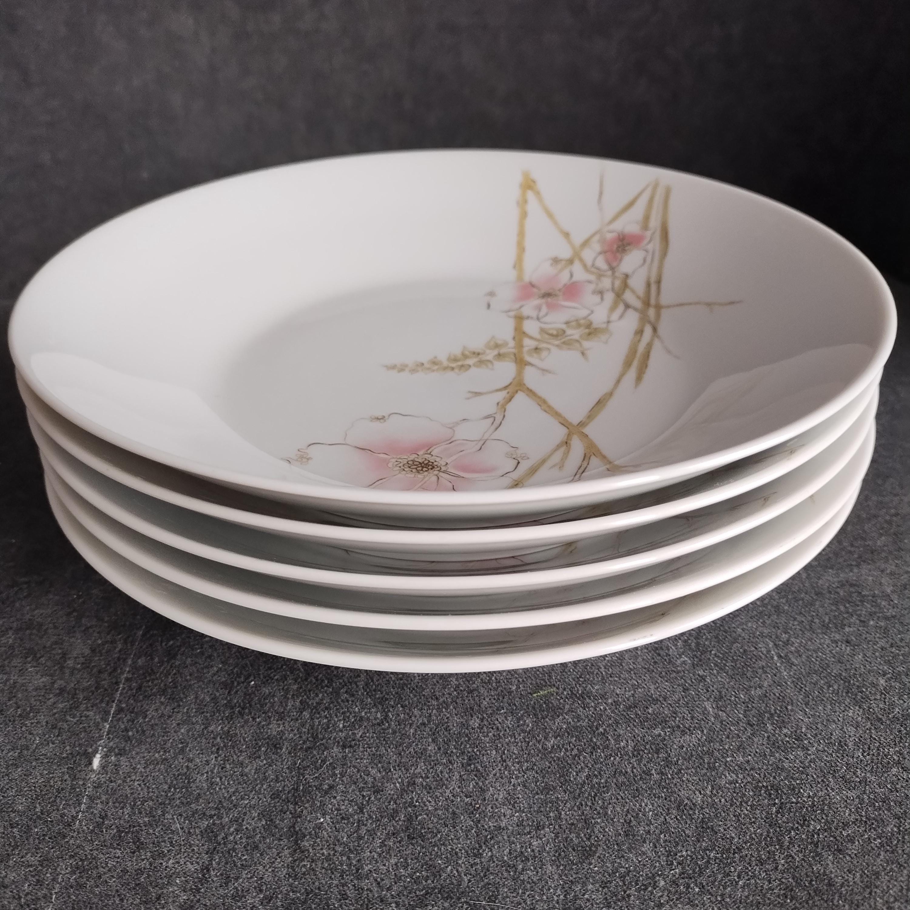 These Rosenthal bone china dishes will add a touch of luxury to your dining table. "BLUSH" features soft pink Dogwood blossoms and tan stems on a crisp white background. Manufactured in Germany from 1963 to 1964. Condition is excellent - no chips, cracks, repairs, or crazing. Minor surface wear consistant with age and very gentle use.
