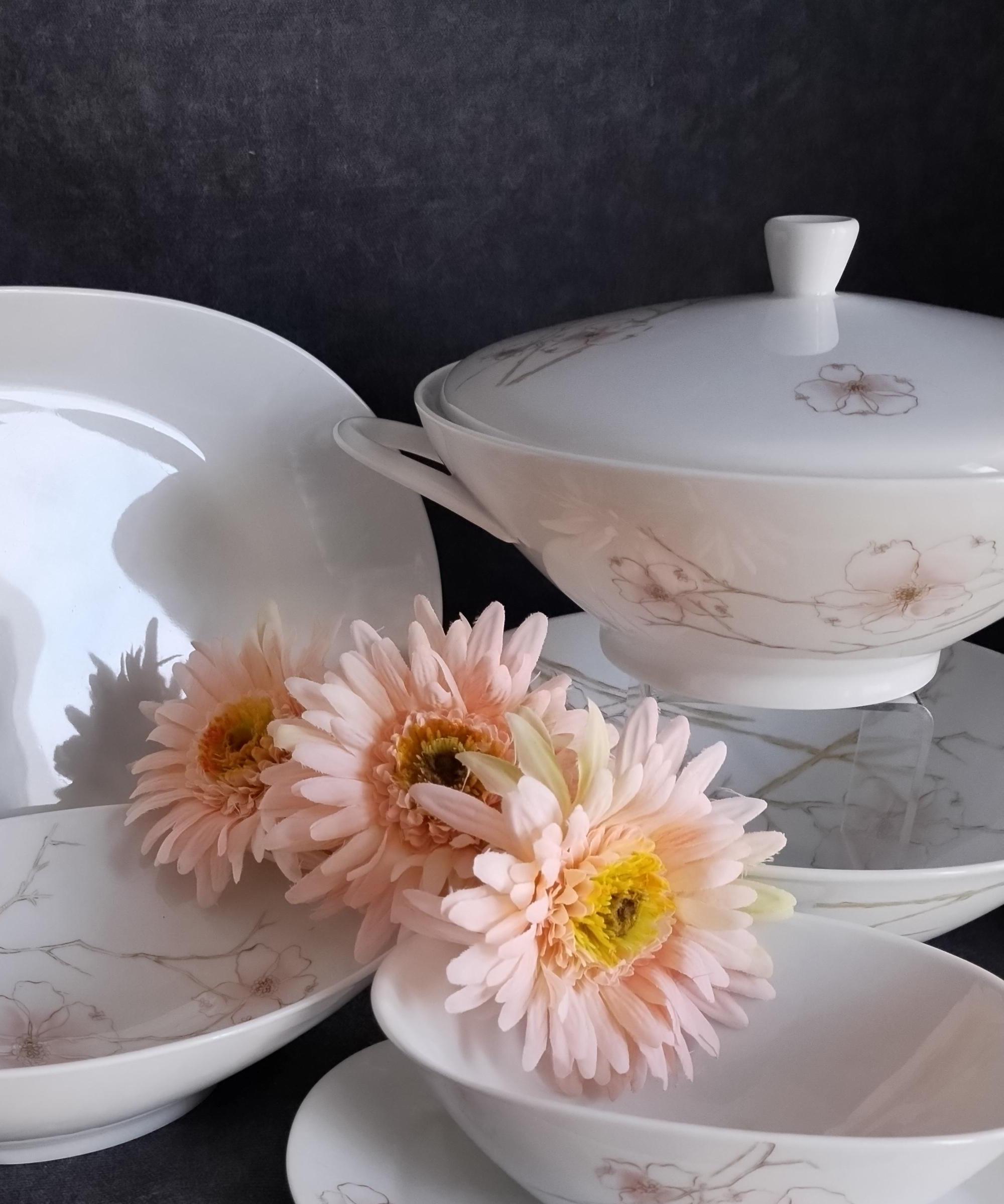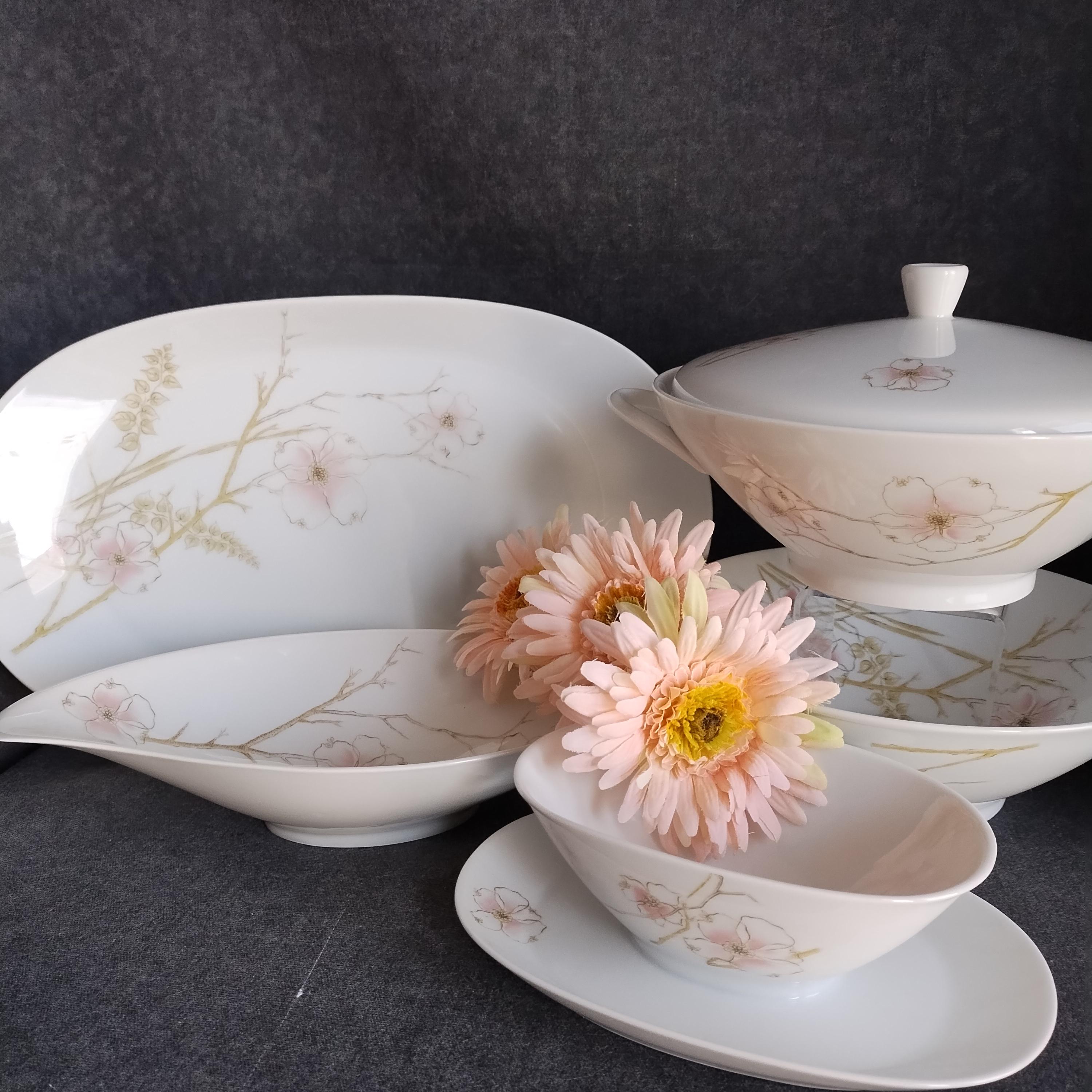 These Rosenthal porcelain serving bowls will add a touch of luxury to your dining table. "BLUSH" features soft pink Dogwood blossoms and tan stems on a crisp white background. Manufactured in Germany from 1963 to 1964. Condition is excellent - no chips, cracks, repairs, or crazing. Minor surface wear consistant with age and very gentle use.