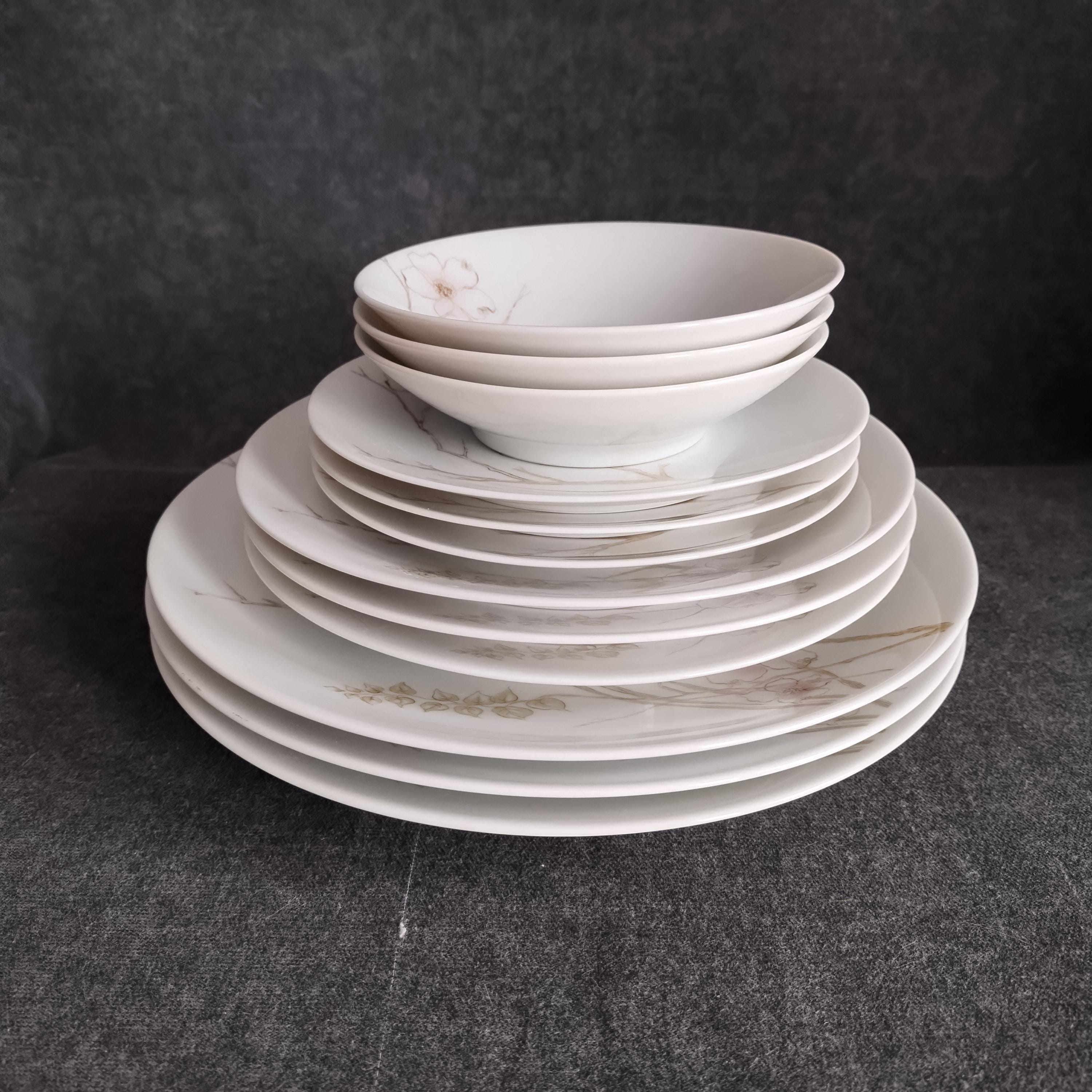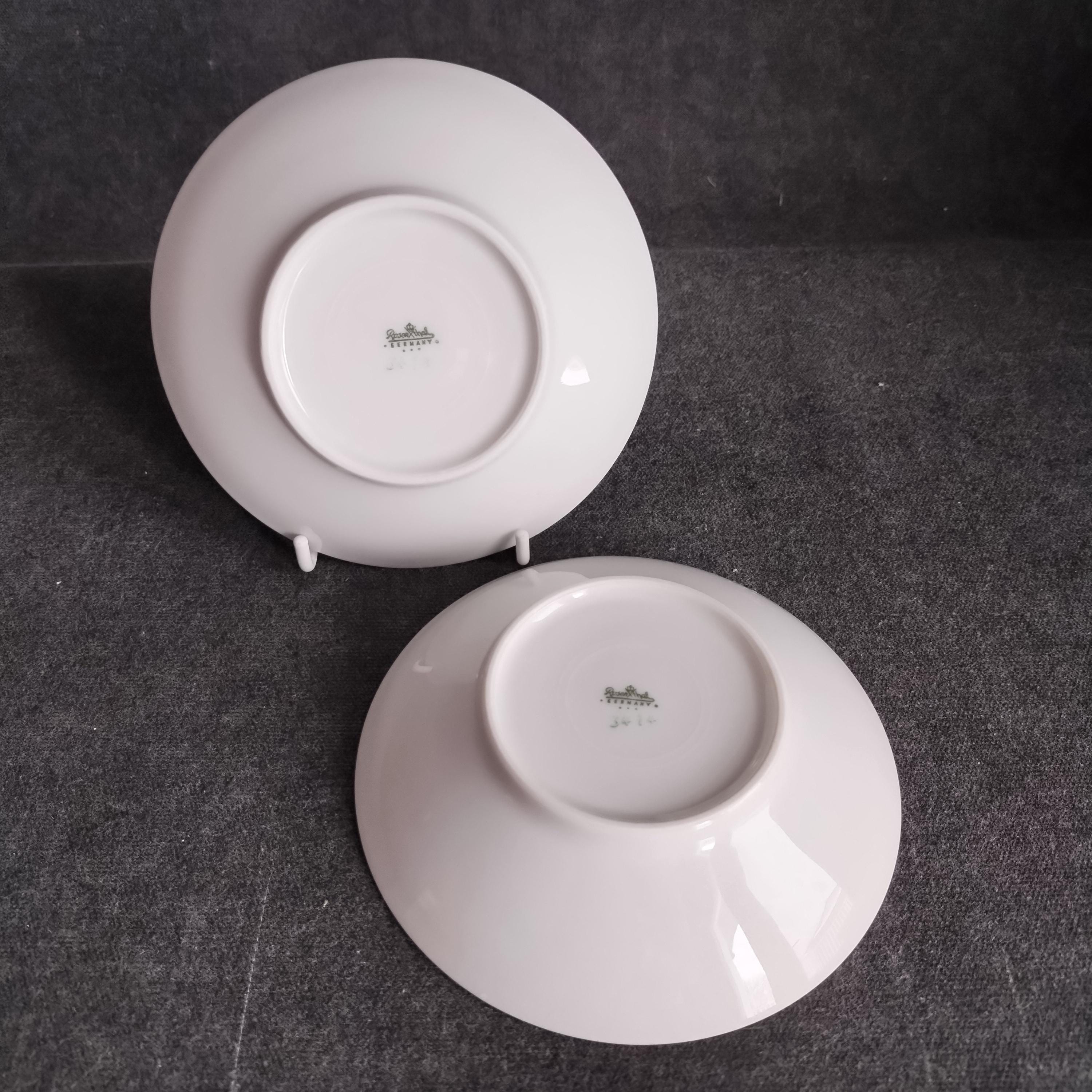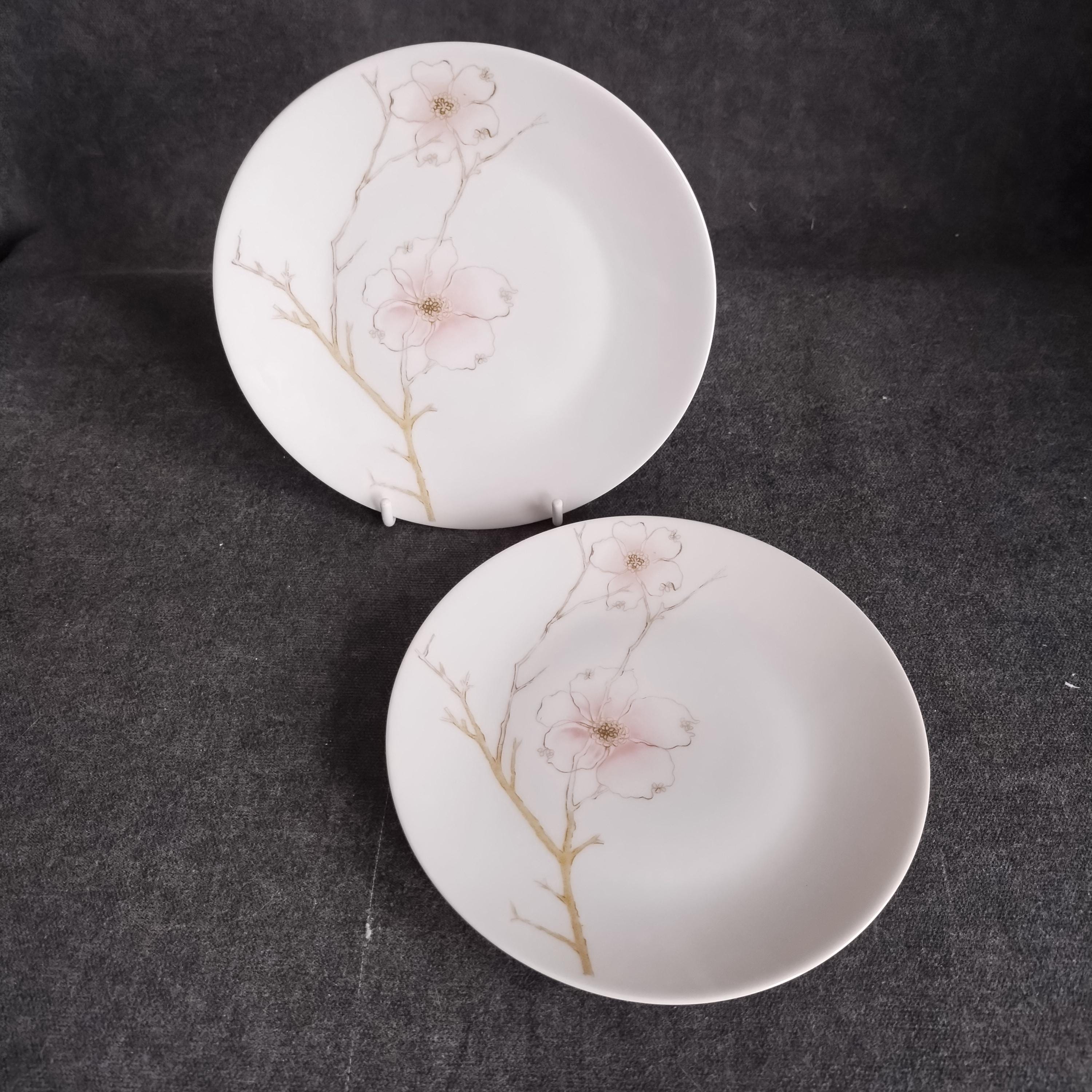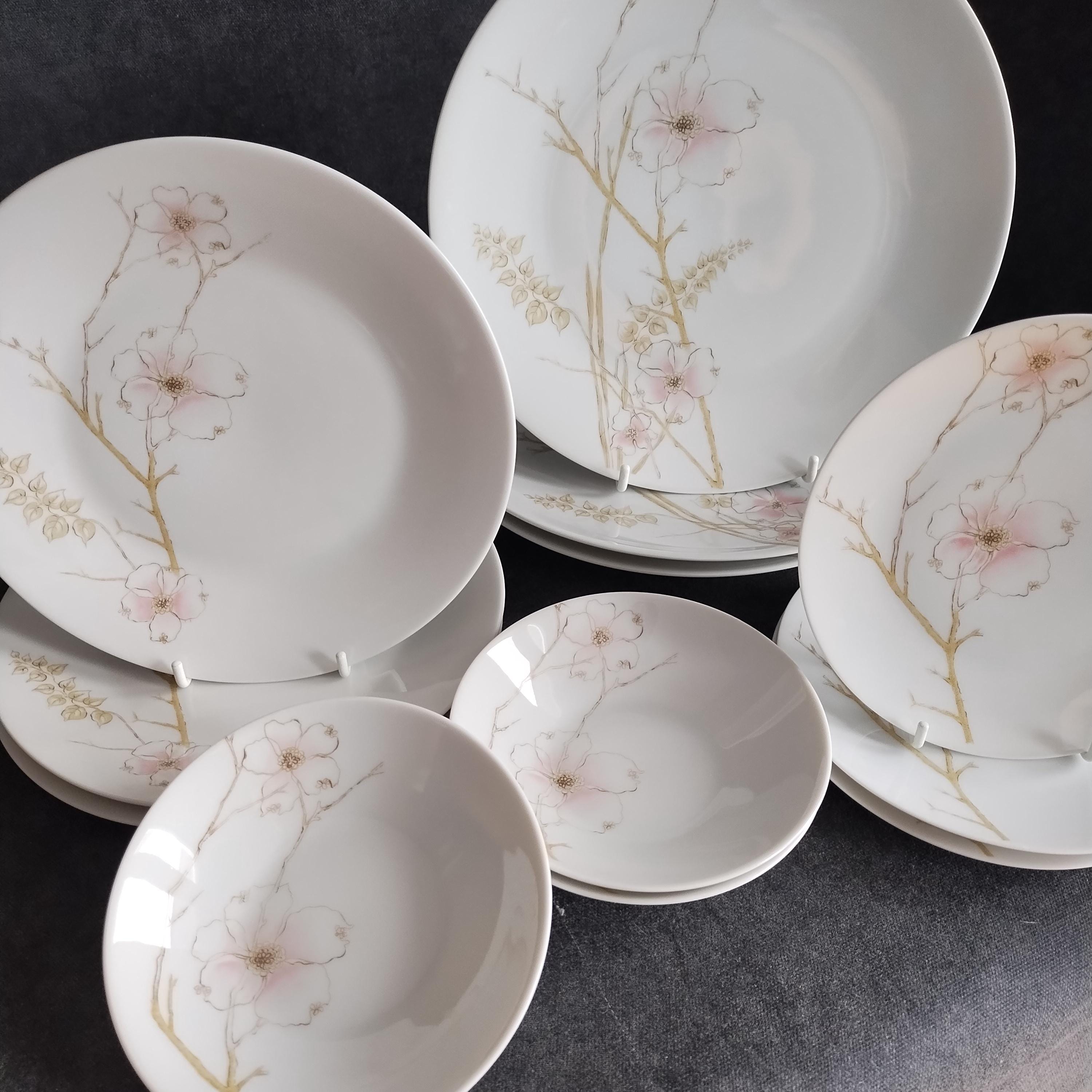 These Rosenthal bone china dishes will add a touch of luxury to your dining table. "BLUSH" features soft pink Dogwood blossoms and tan stems on a crisp white background. Manufactured in Germany from 1963 to 1964. Condition is excellent - no chips, cracks, repairs, or crazing. Minor surface wear consistant with age and very gentle use.