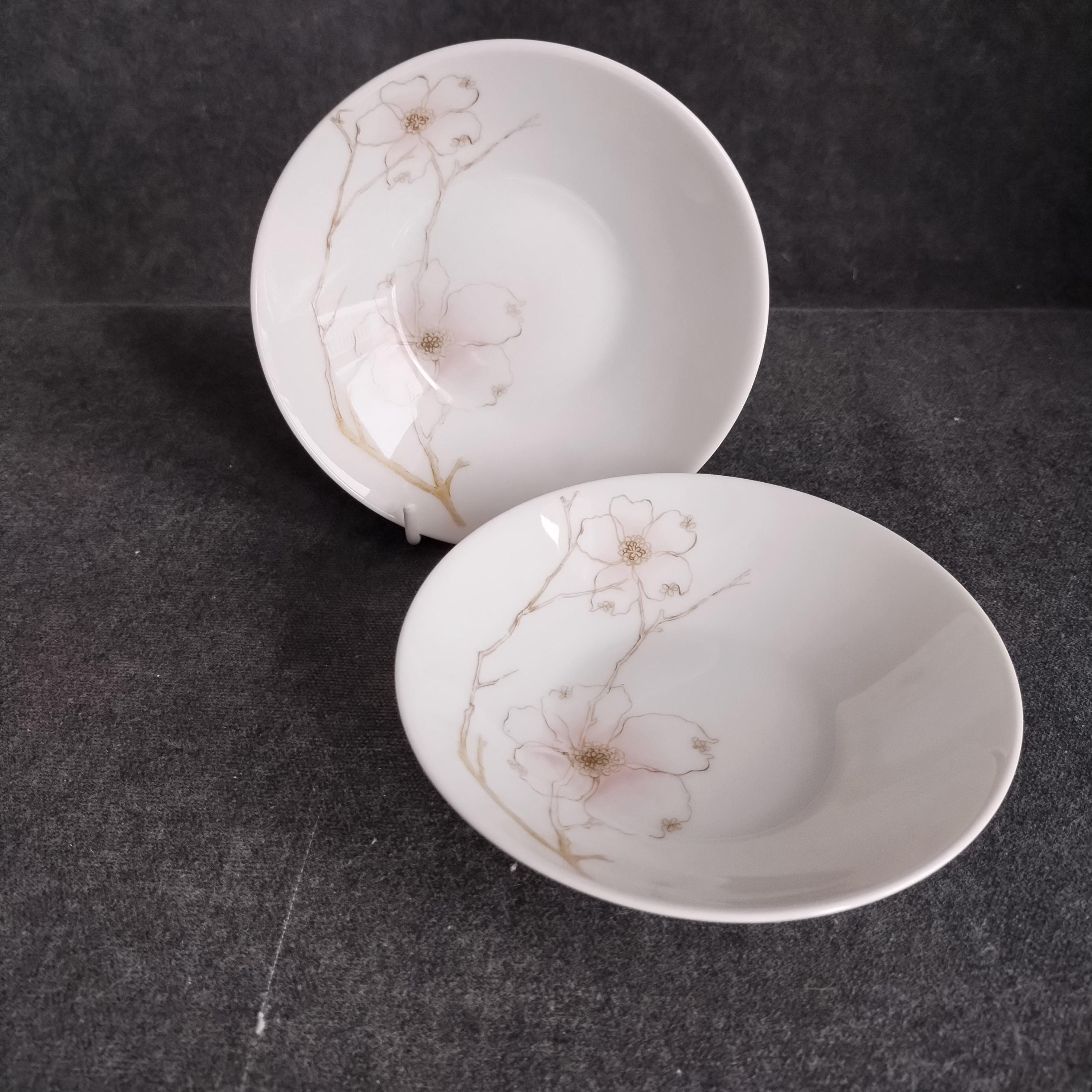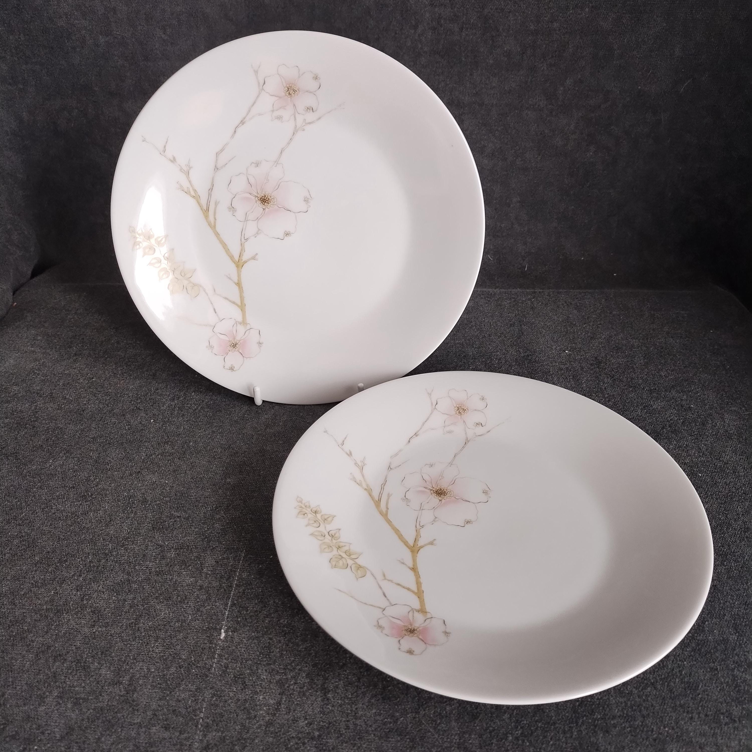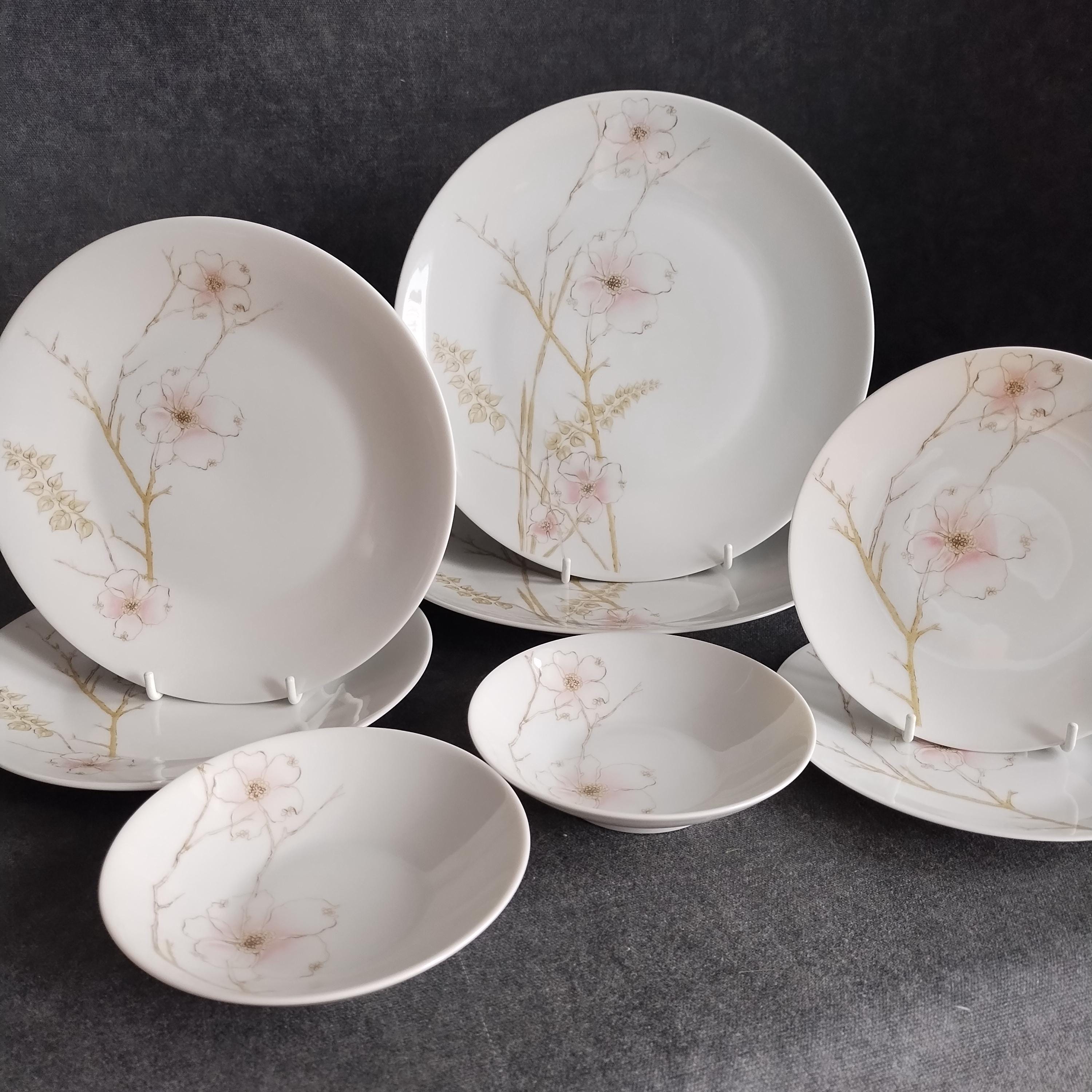 These Rosenthal bone china dishes will add a touch of luxury to your dining table. "BLUSH" features soft pink Dogwood blossoms and tan stems on a crisp white background. Manufactured in Germany from 1963 to 1964. Condition is excellent - no chips, cracks, repairs, or crazing. Minor surface wear consistant with age and very gentle use.