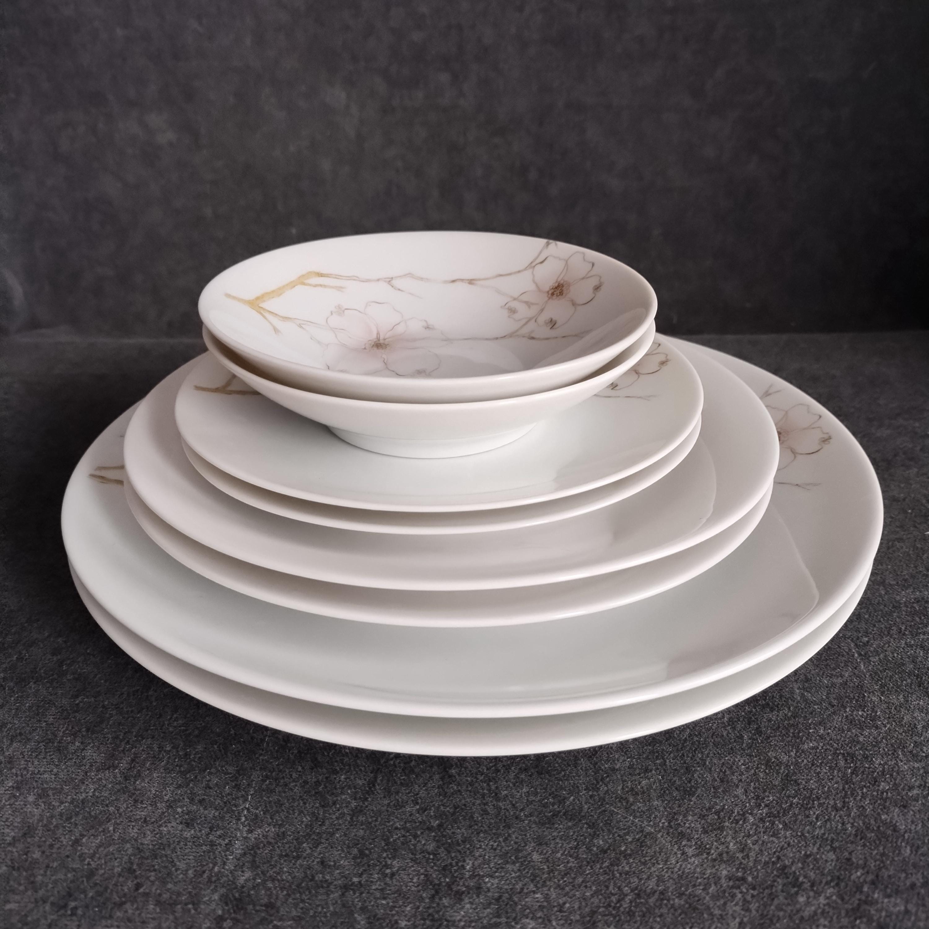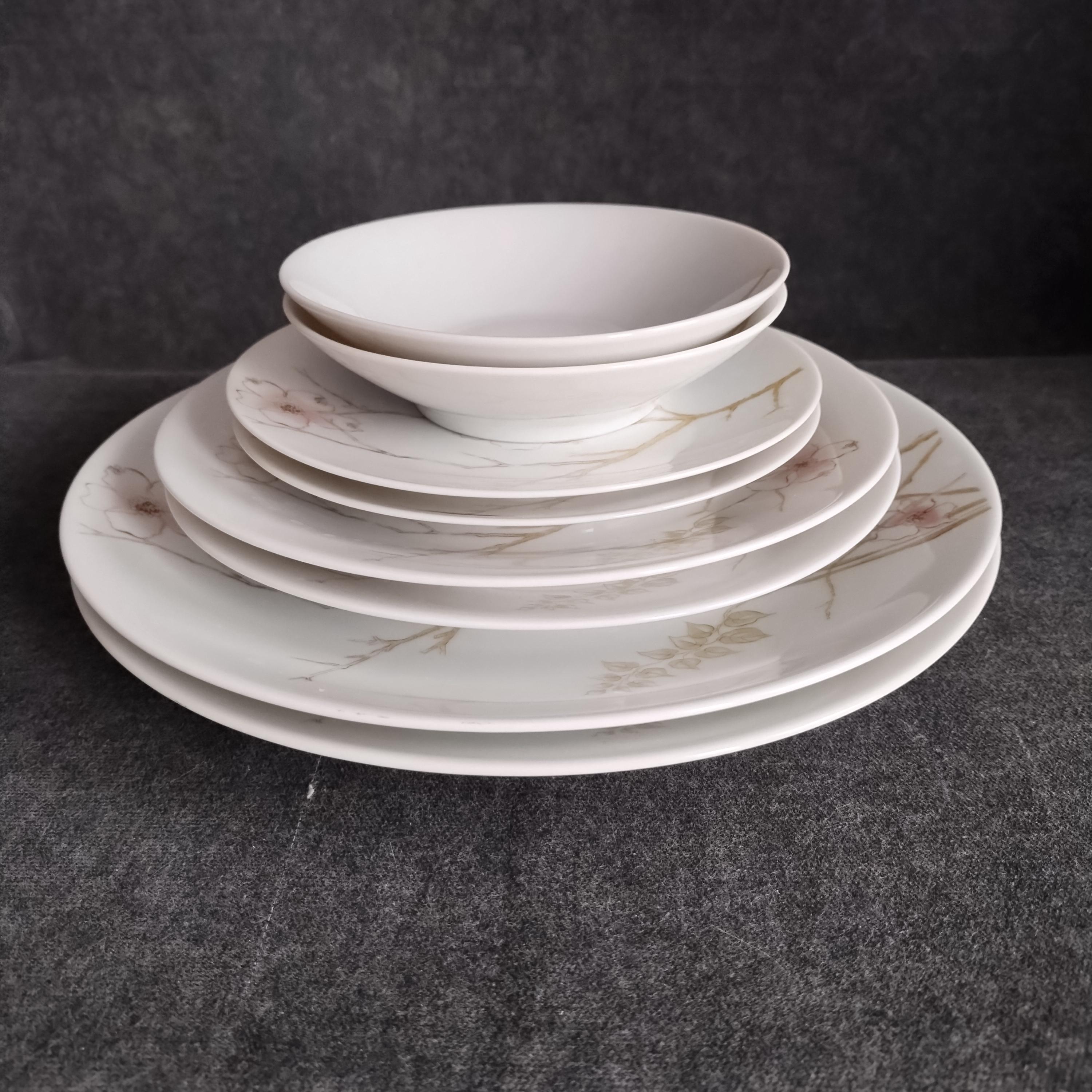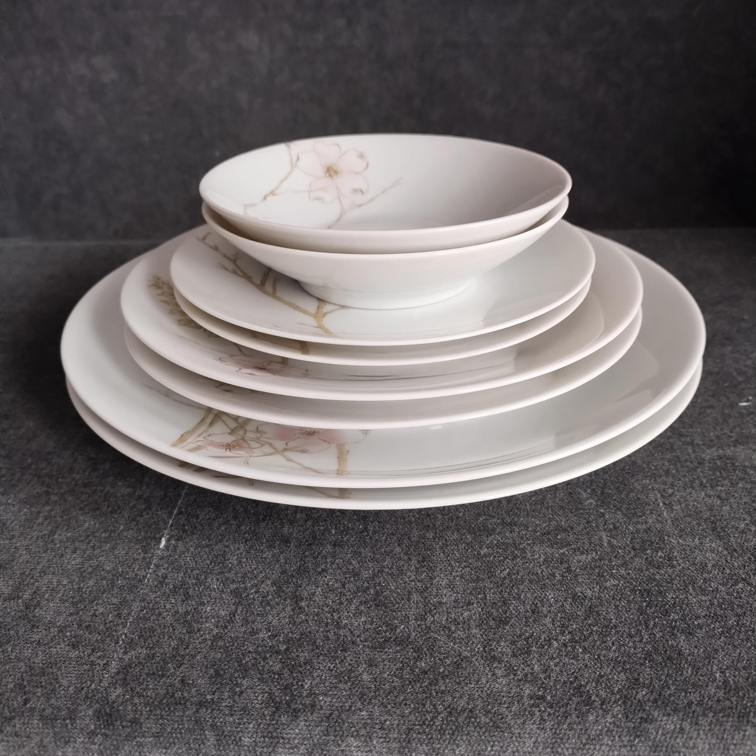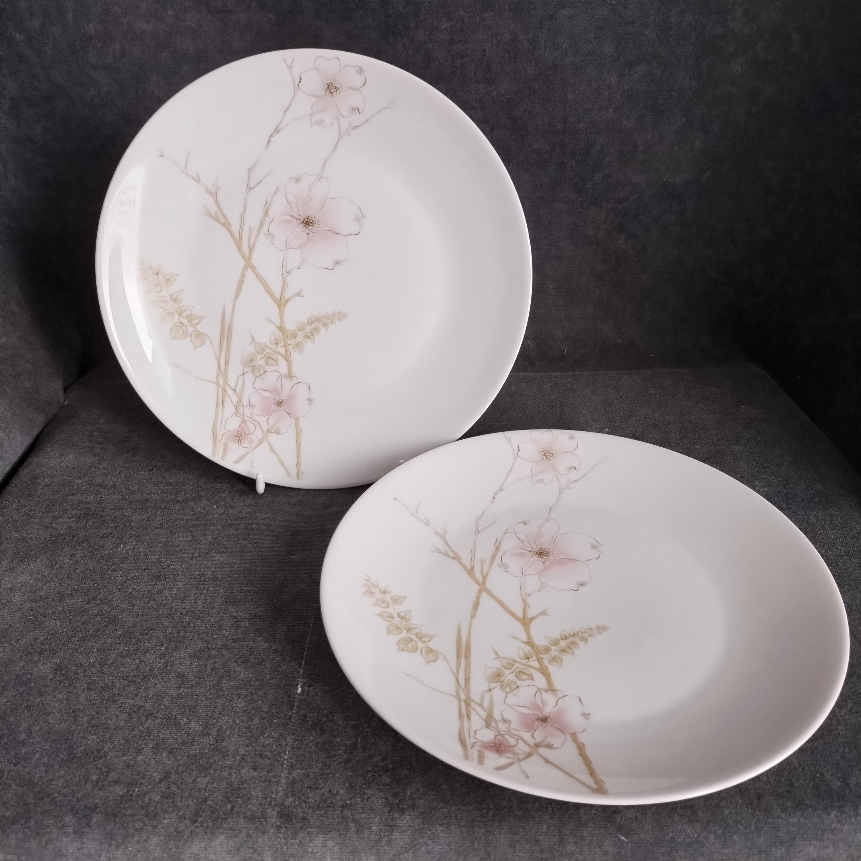 These Rosenthal bone china dishes will add a touch of luxury to your dining table. "BLUSH" features soft pink Dogwood blossoms and tan stems on a crisp white background. Manufactured in Germany from 1963 to 1964. Condition is excellent - no chips, cracks, repairs, or crazing. Minor surface wear consistant with age and very gentle use.