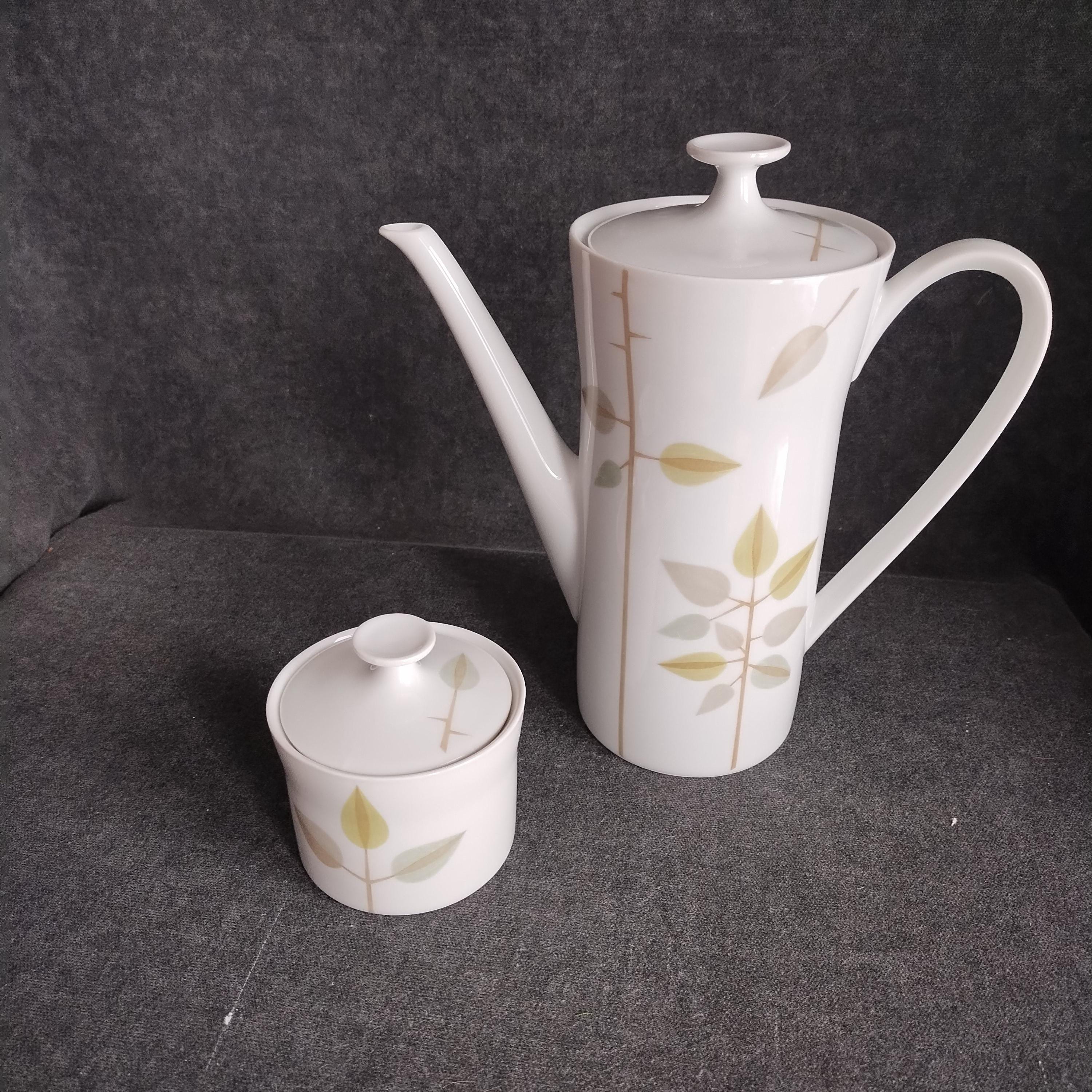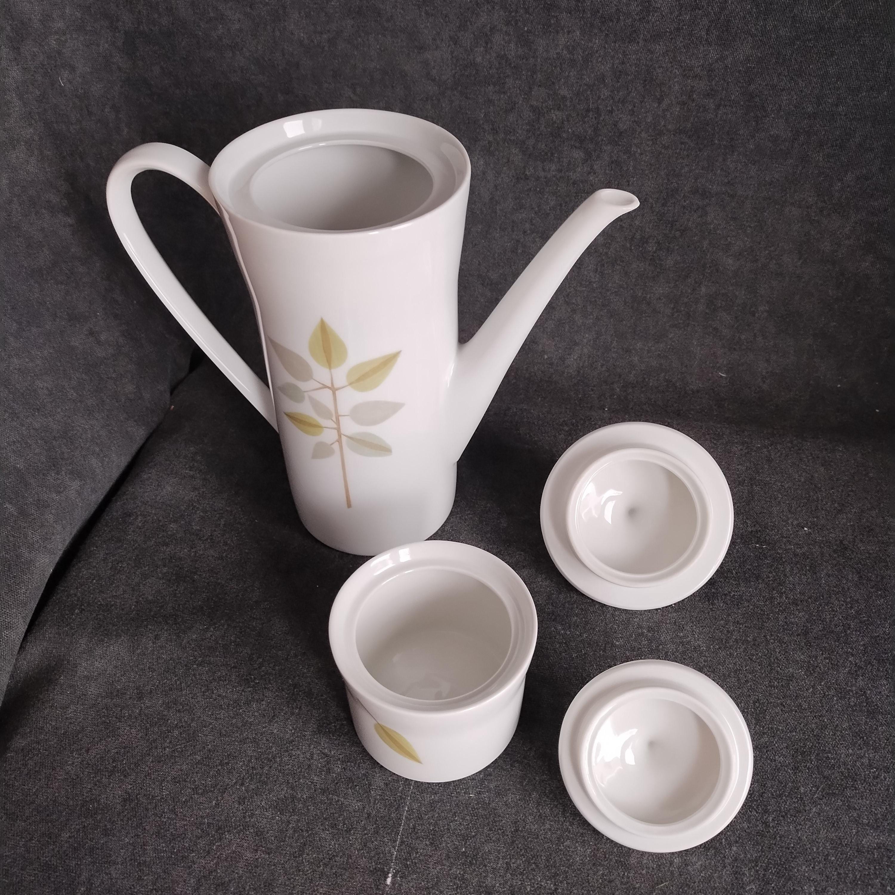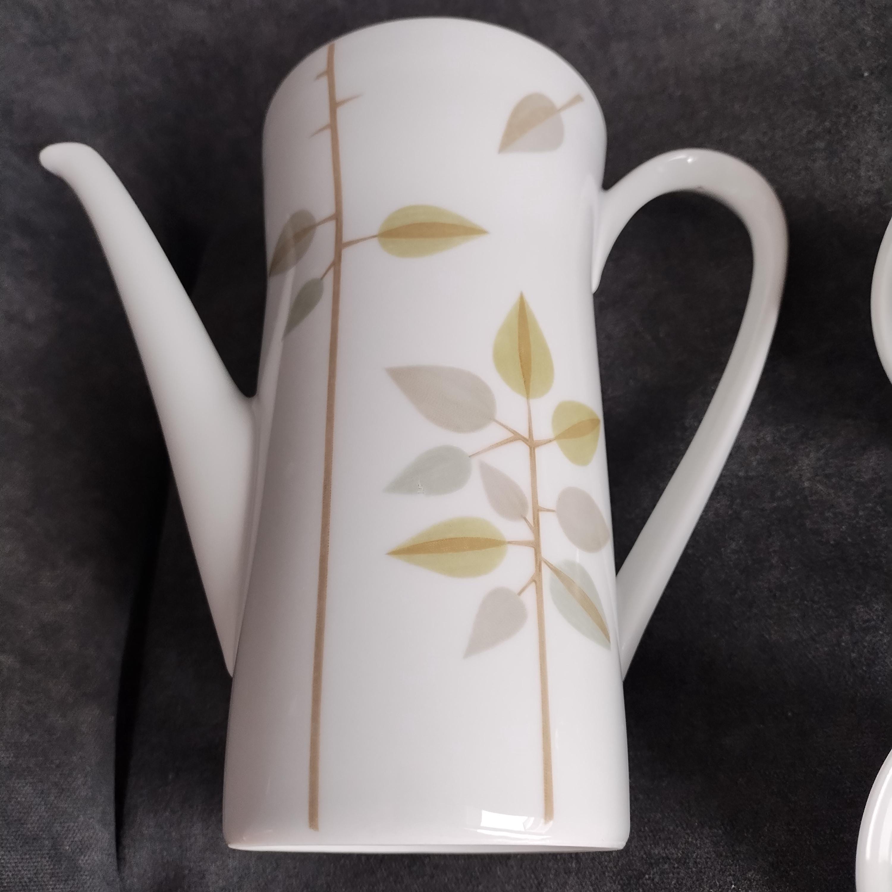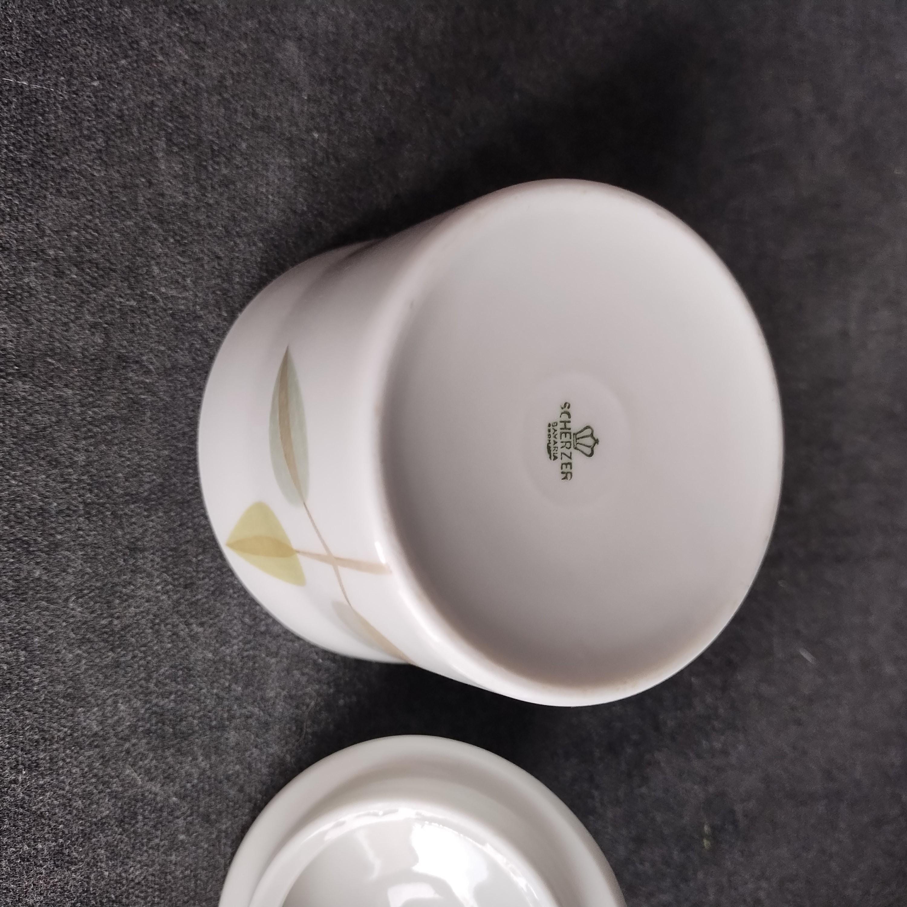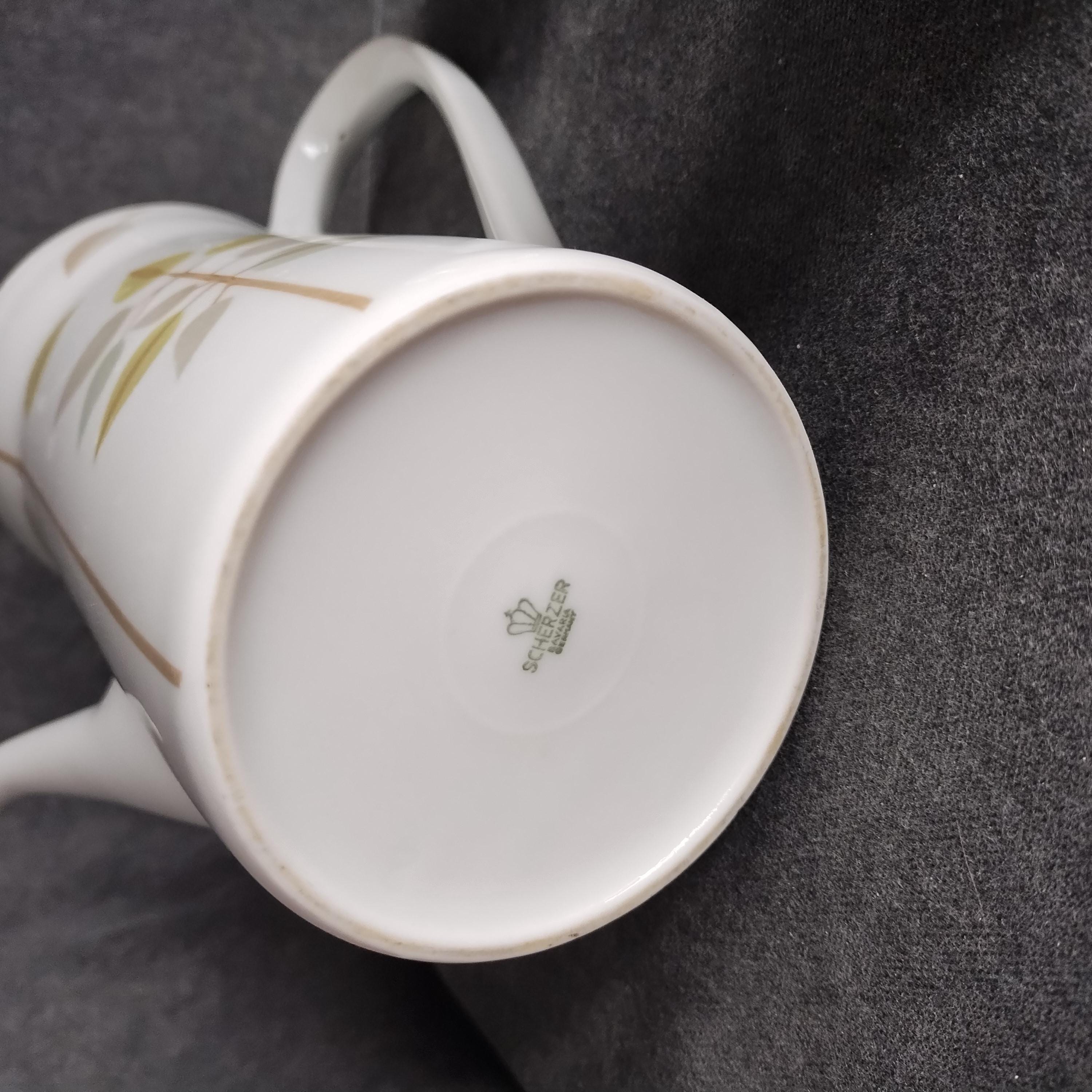 Fabulous Scherzer Bavaria German porcelain coffee set. Crisp white ceramic with green, blue, and grey leaves and tan stems. Perfect for weekend breakfast or afternoon coffee. Condition is very good with minor surface wear consistant with age and gentle use. No chips, cracks, repairs, staining, or crazing.