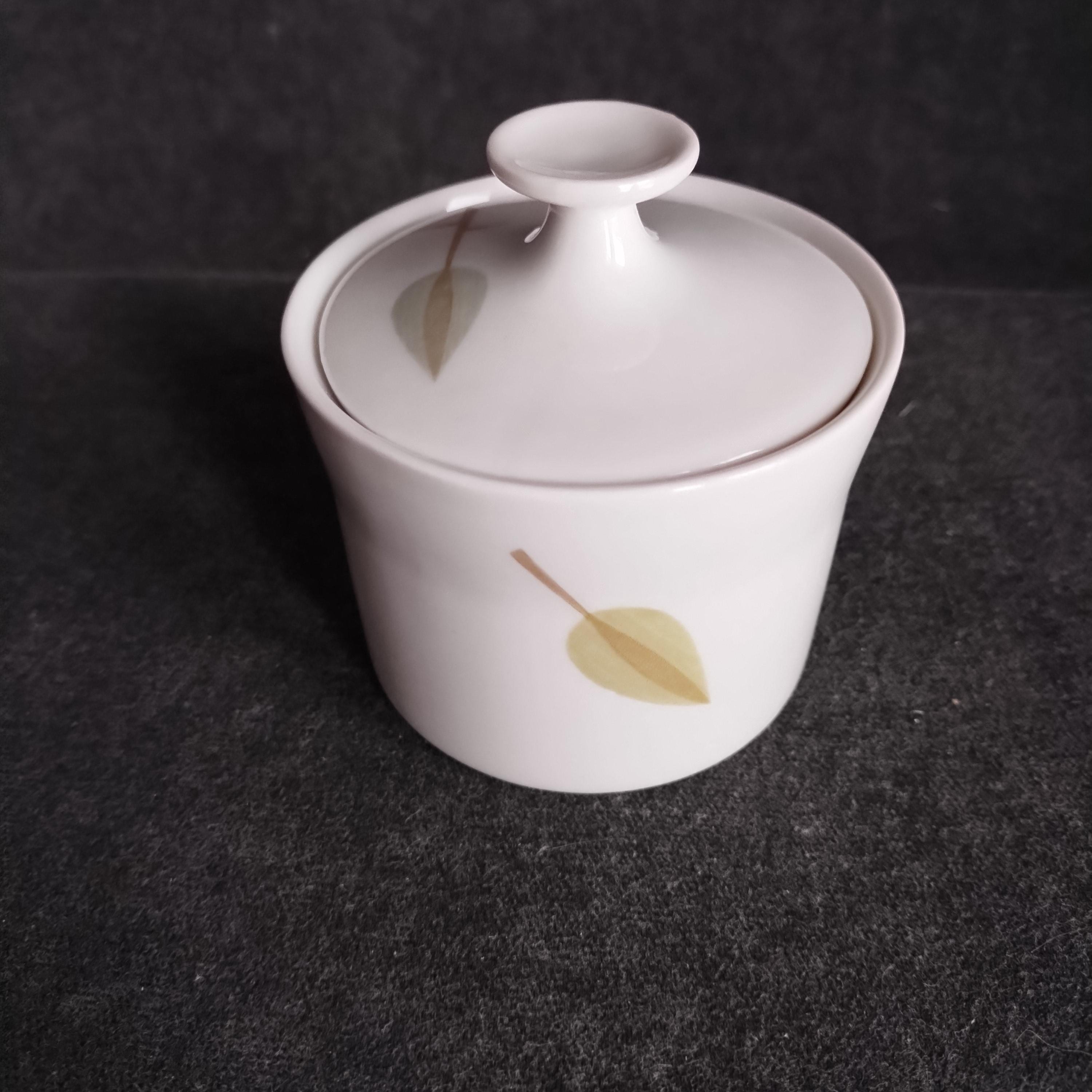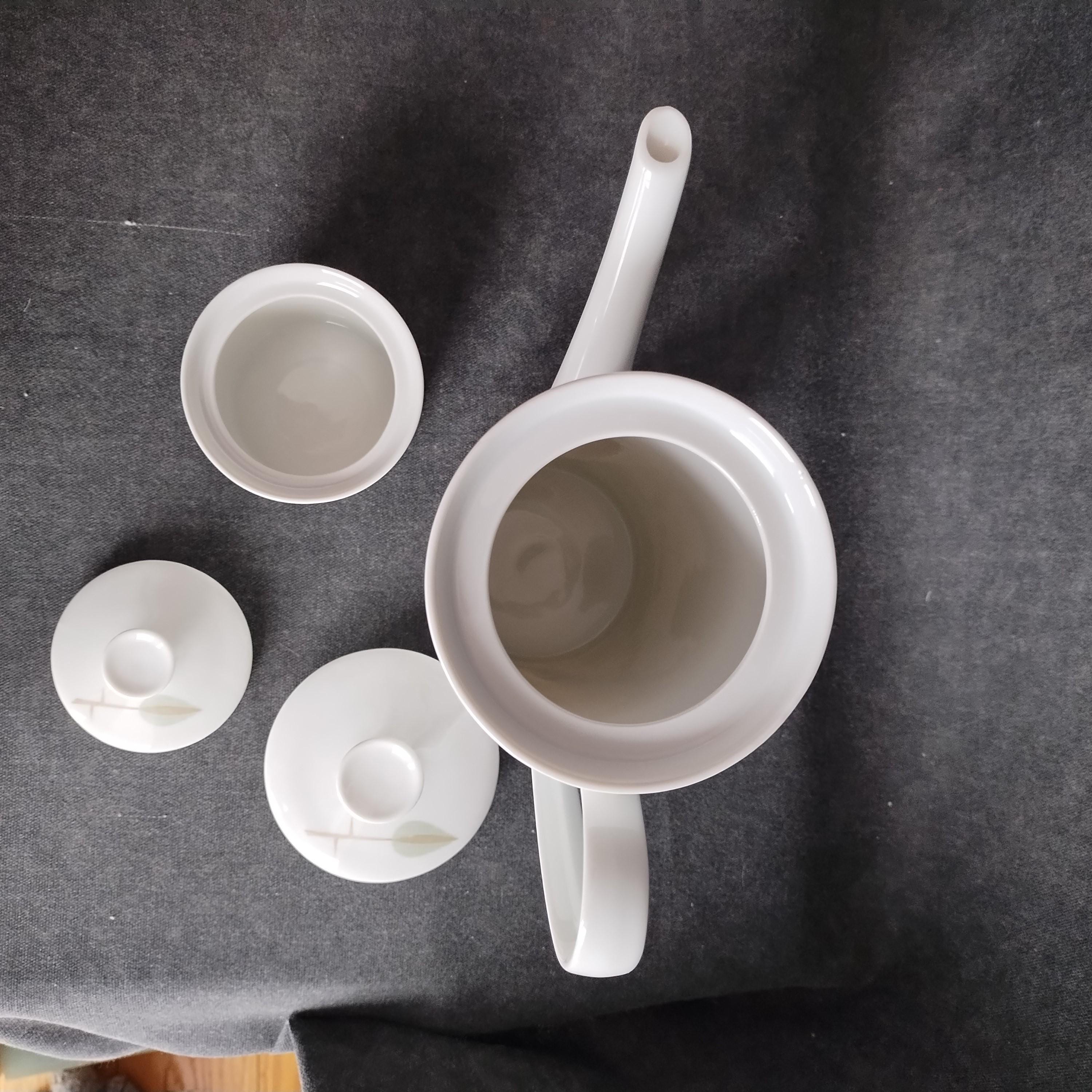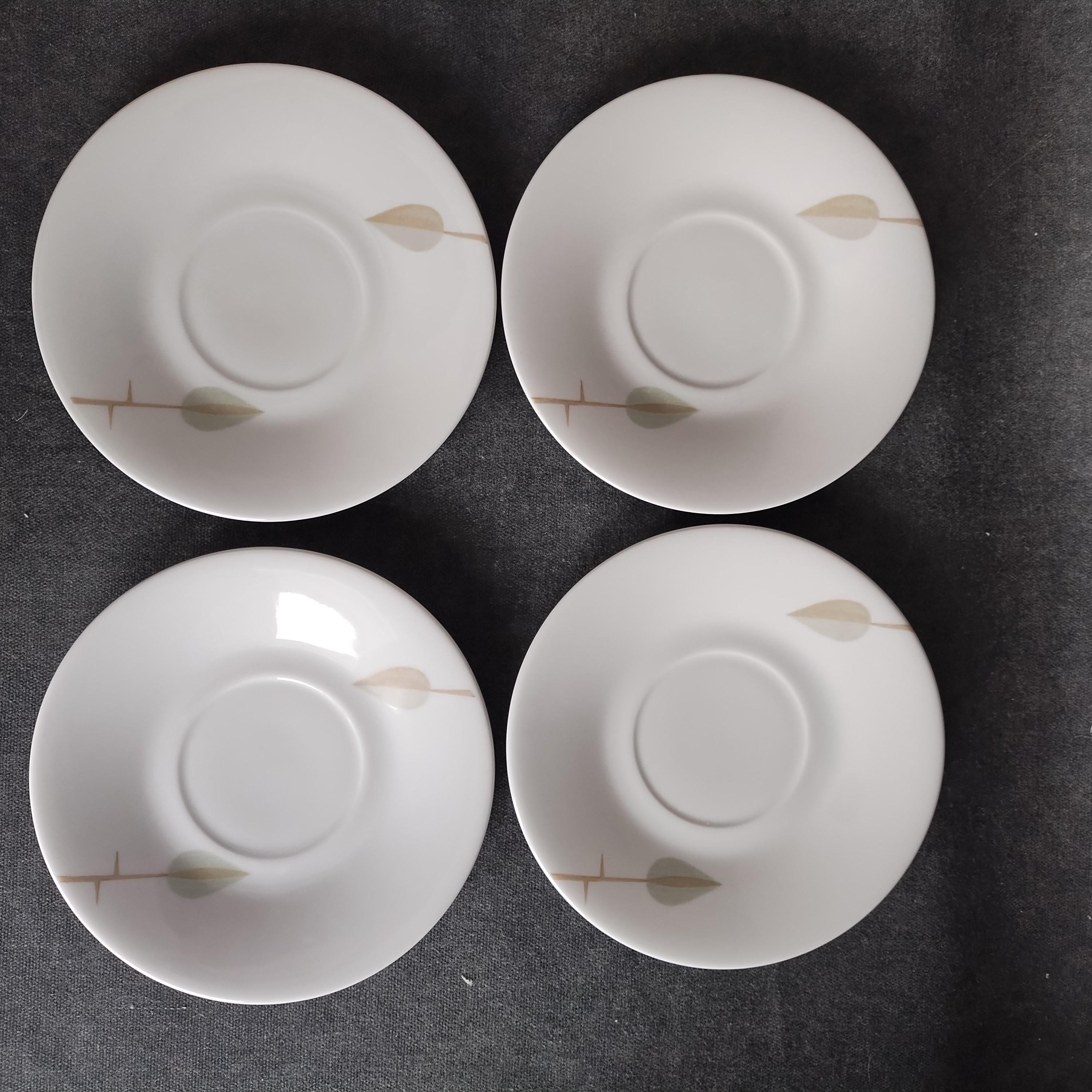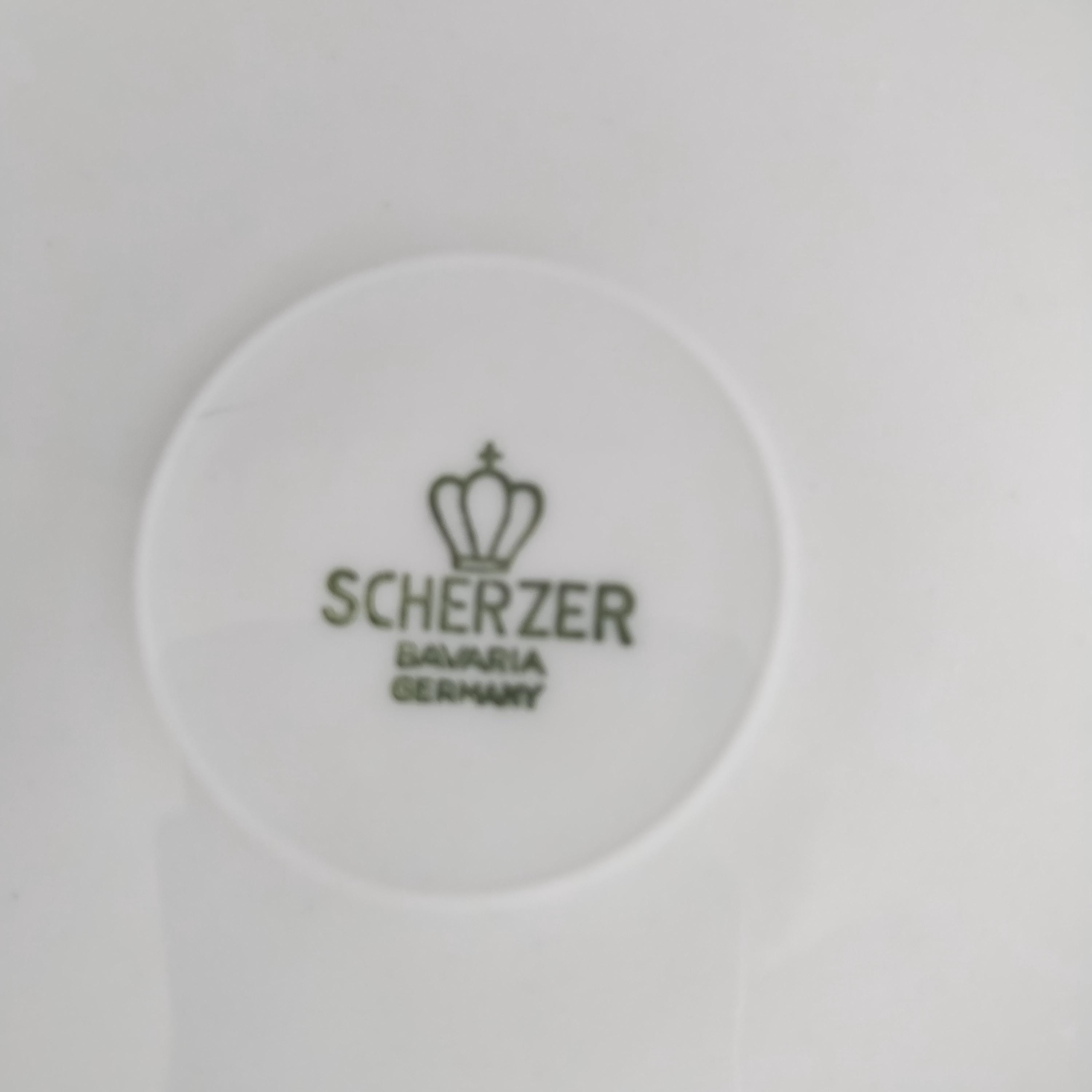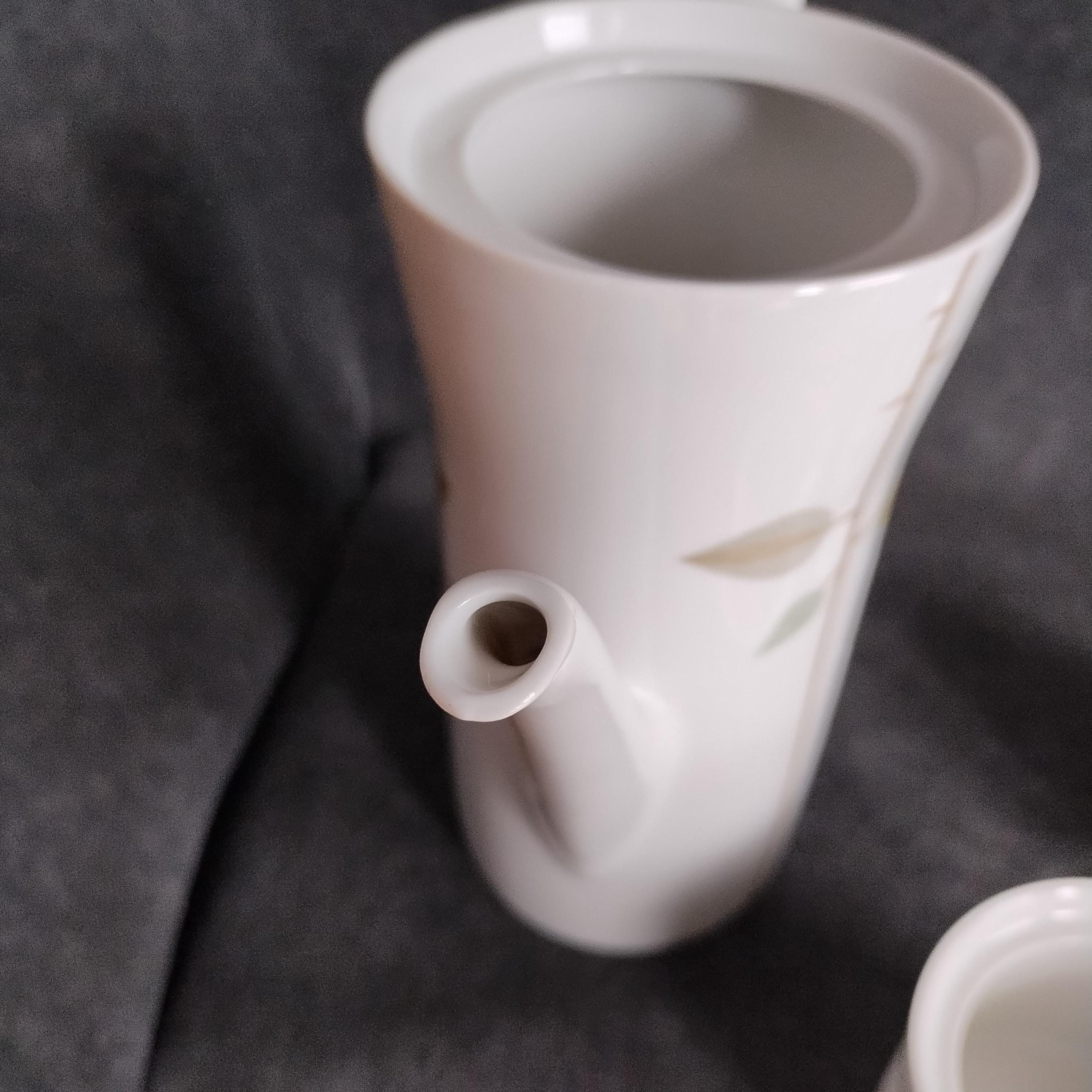 Fabulous Scherzer Bavaria German porcelain coffee set. Crisp white ceramic with green, blue, and grey leaves and tan stems. Perfect for weekend breakfast or afternoon coffee. Condition is very good with minor surface wear consistant with age and gentle use. No chips, cracks, repairs, staining, or crazing.