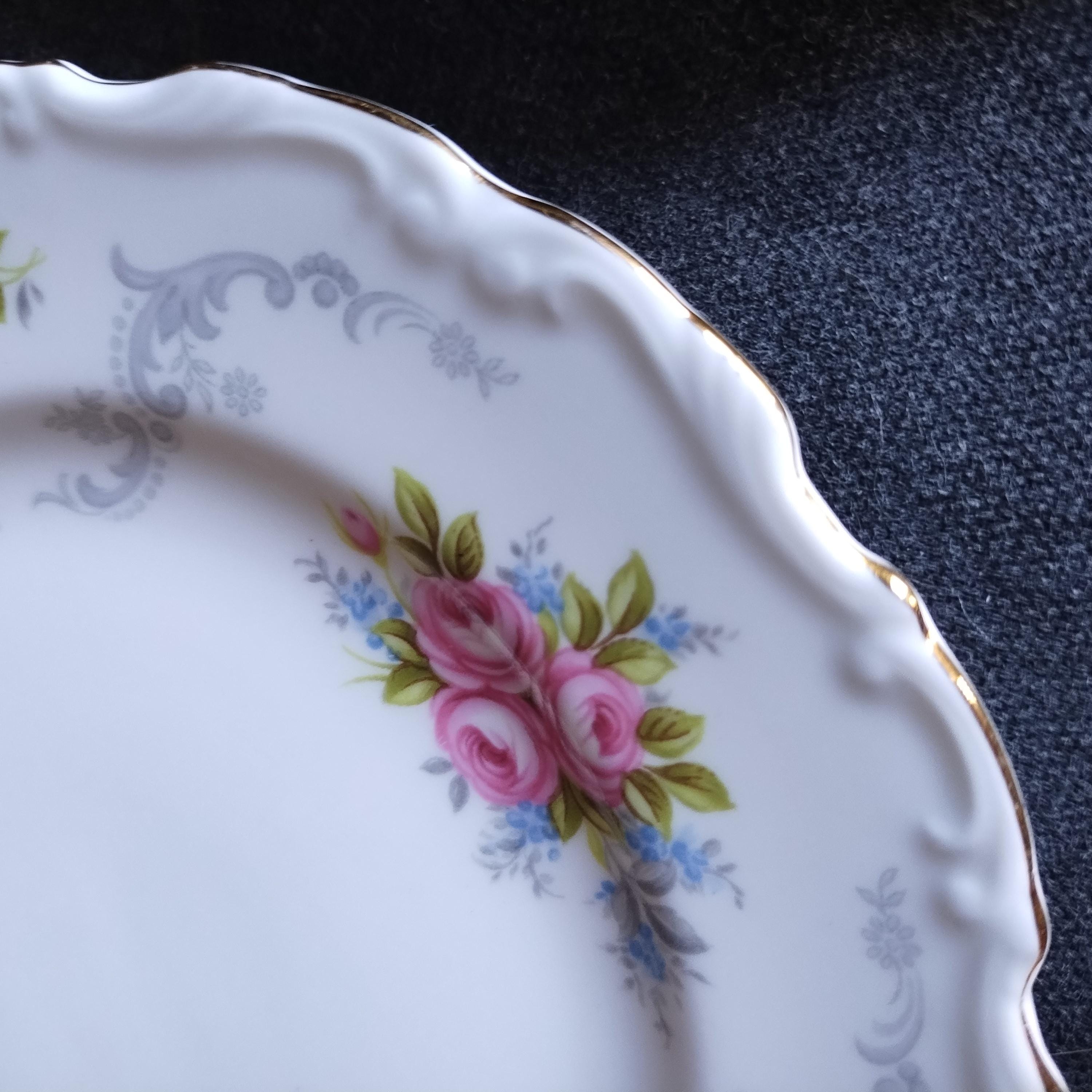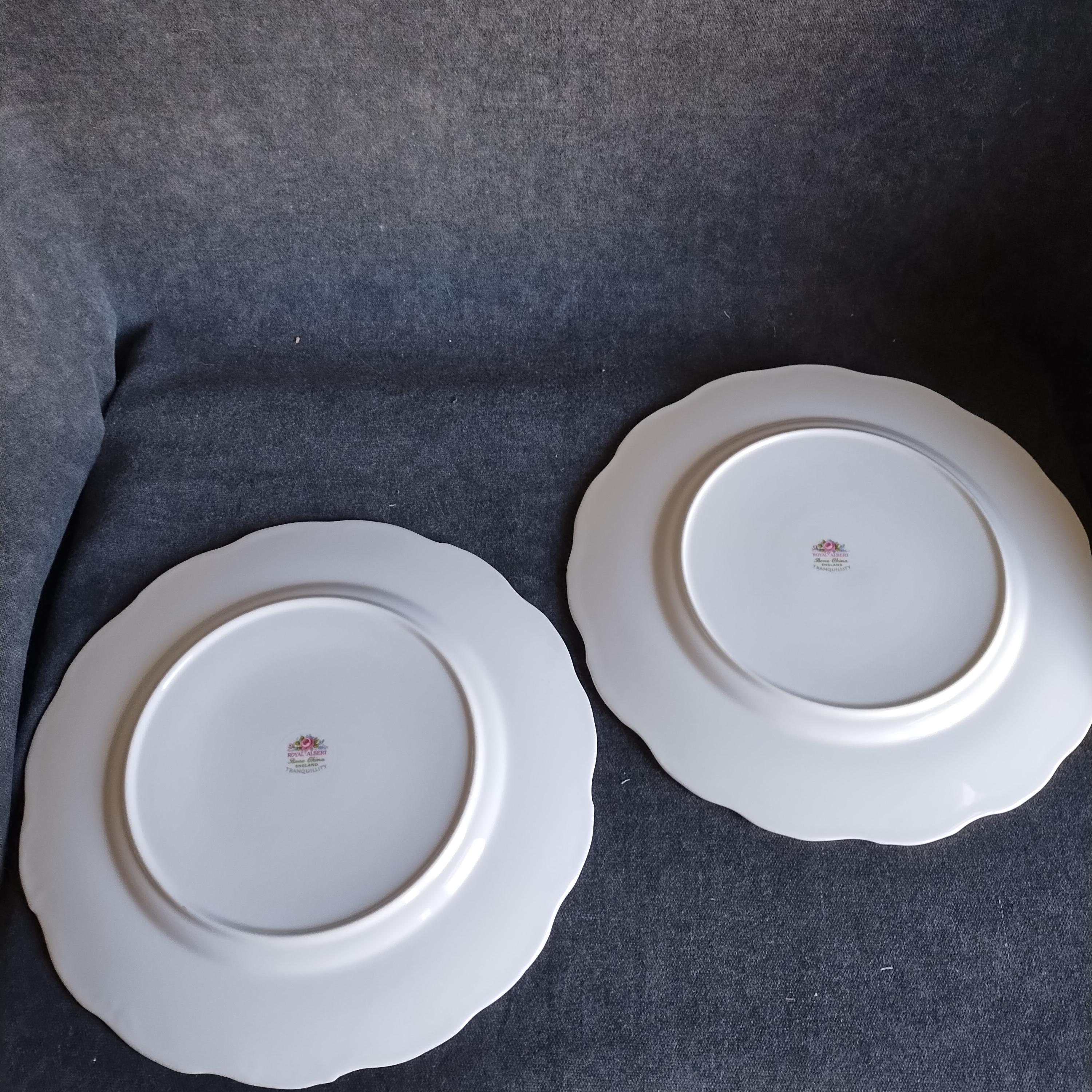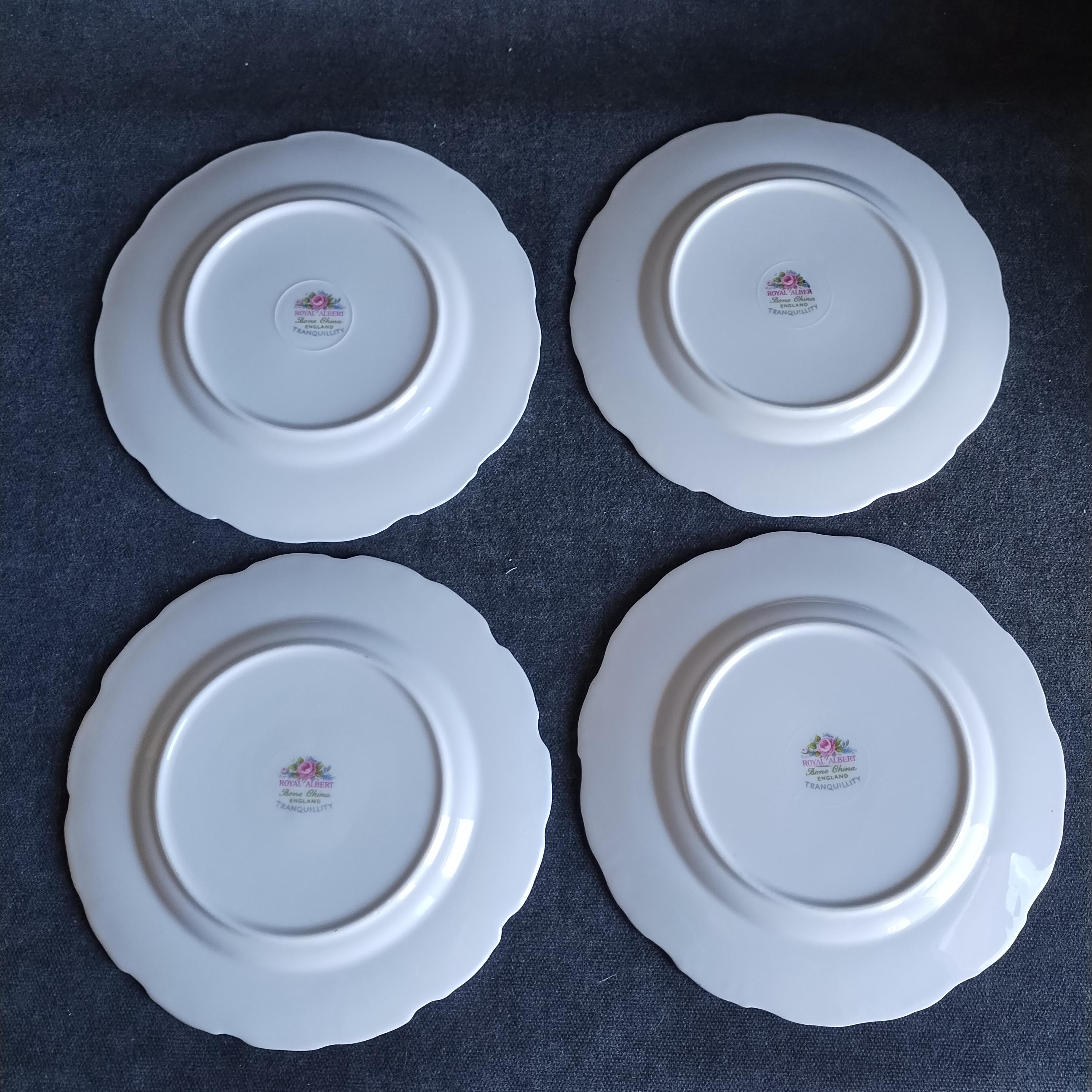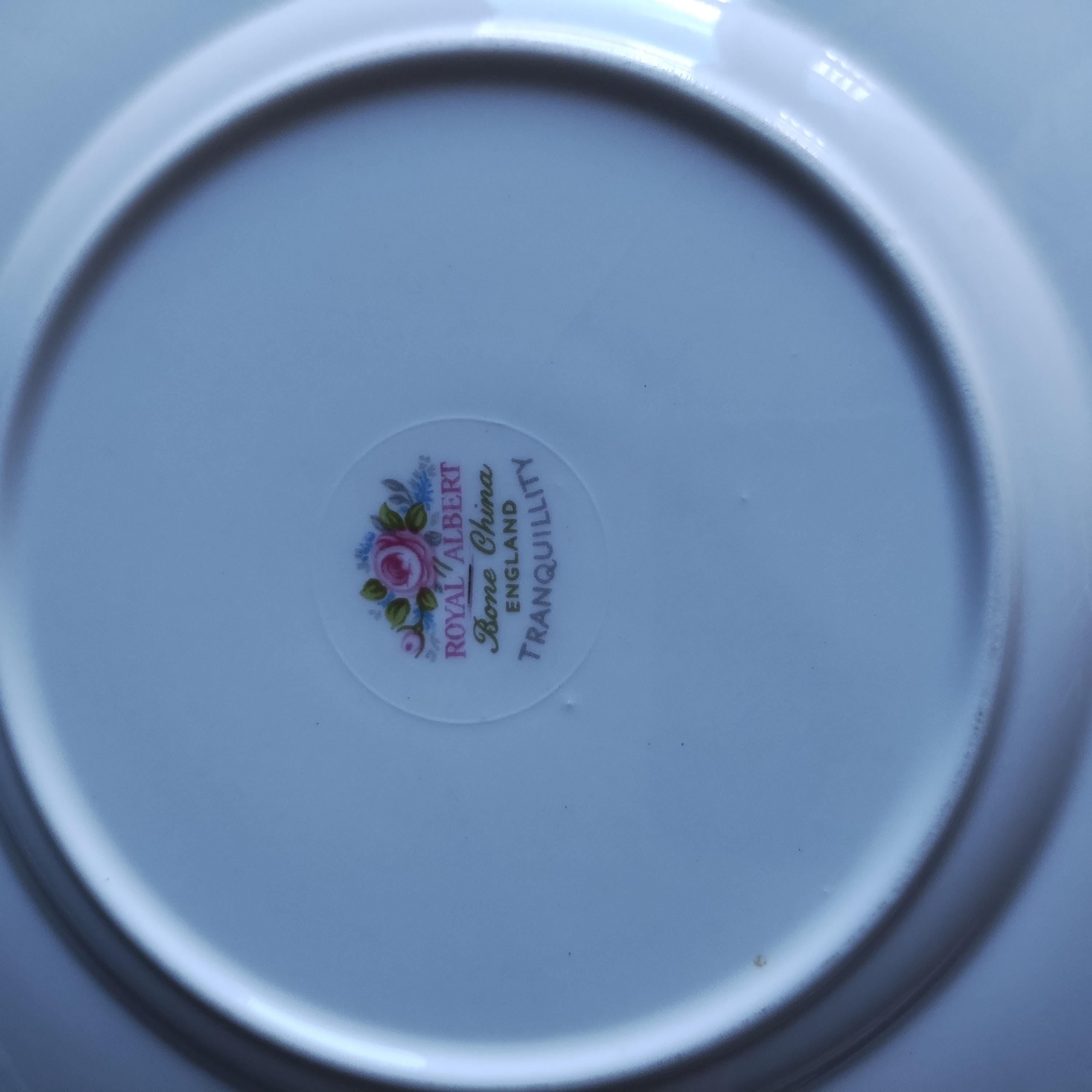 So pretty and delicate, these Royal Albert "Tranquillity" pattern plates will add a touch of class to any dining table. This bone china pattern features tiny clusters of pink roses accented with green leaves and blue sprays. The rims are adorned with light gray scrolls and have an embossed edge trimmed with gold. Tranquillity was produced from 1969-1998. Condition is excellent - no chips, cracks, repairs, or crazing. Minor surface wear consistant with age and very gentle use.
