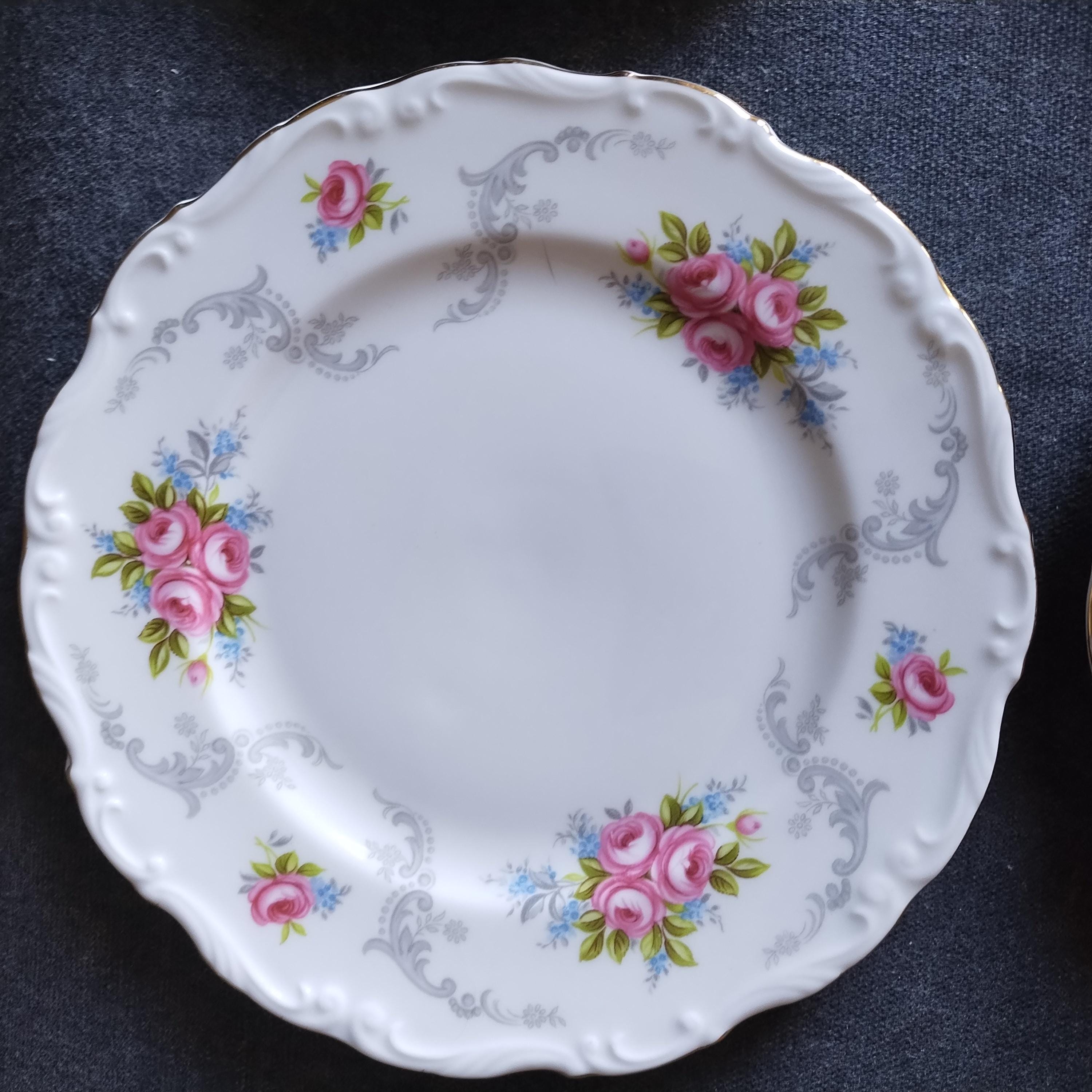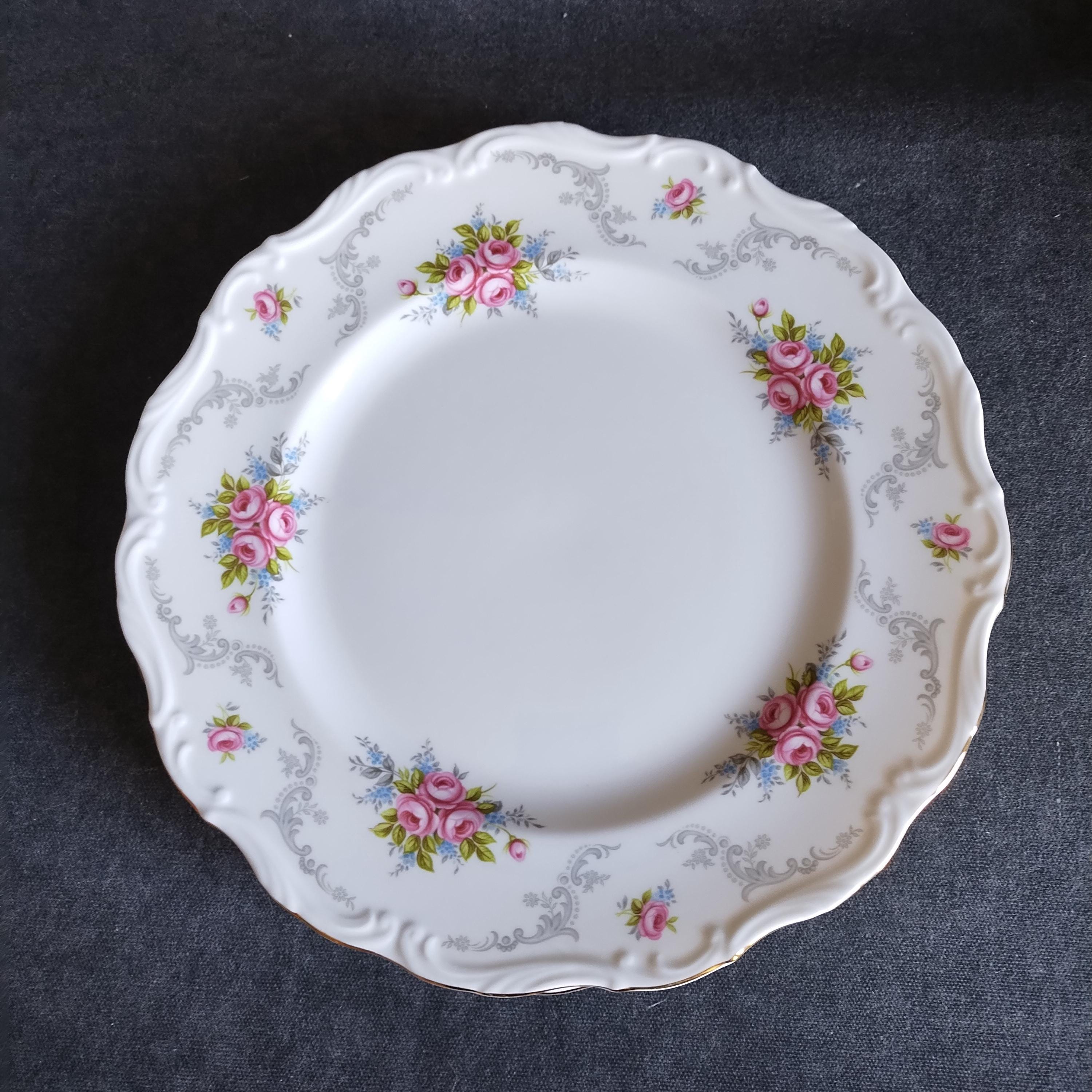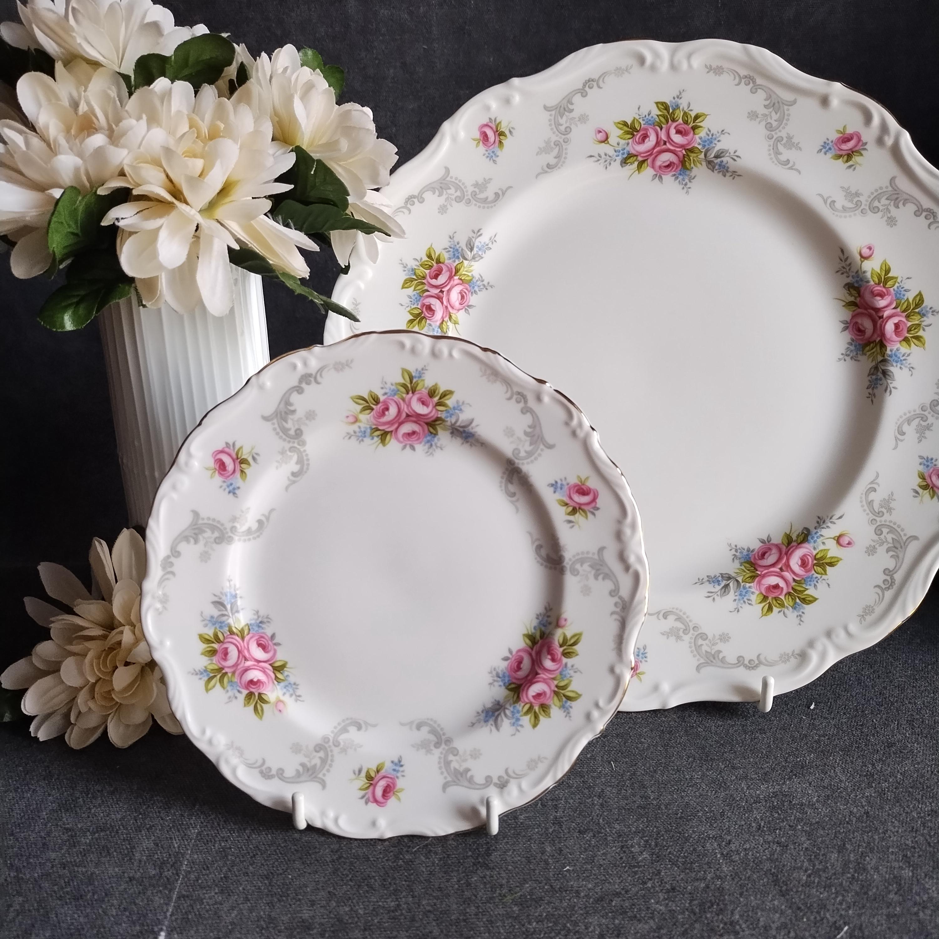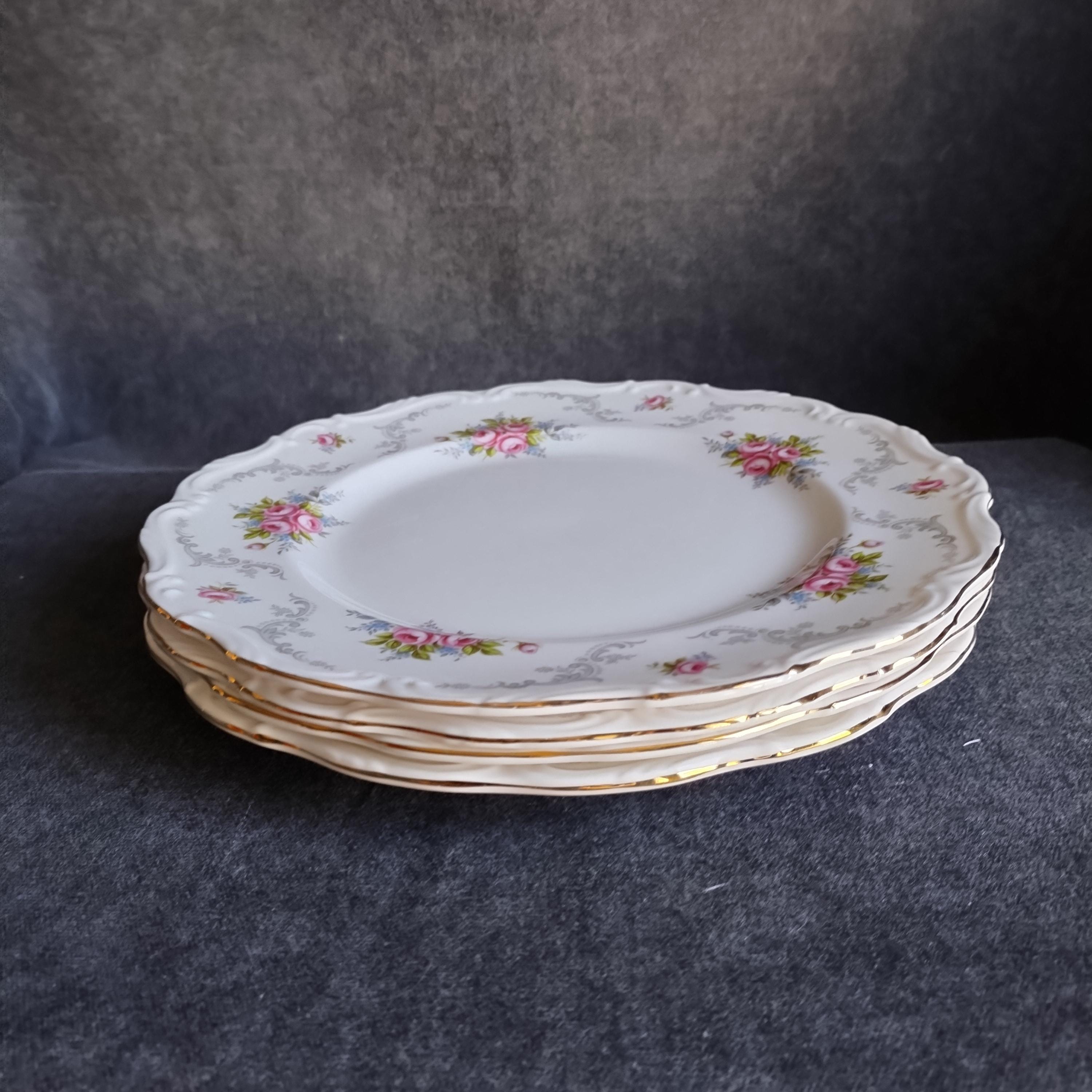 So pretty and delicate, these Royal Albert "Tranquillity" pattern plates will add a touch of class to any dining table. This bone china pattern features tiny clusters of pink roses accented with green leaves and blue sprays. The rims are adorned with light gray scrolls and have an embossed edge trimmed with gold. Tranquillity was produced from 1969-1998. Condition is excellent - no chips, cracks, repairs, or crazing. Minor surface wear consistant with age and very gentle use.