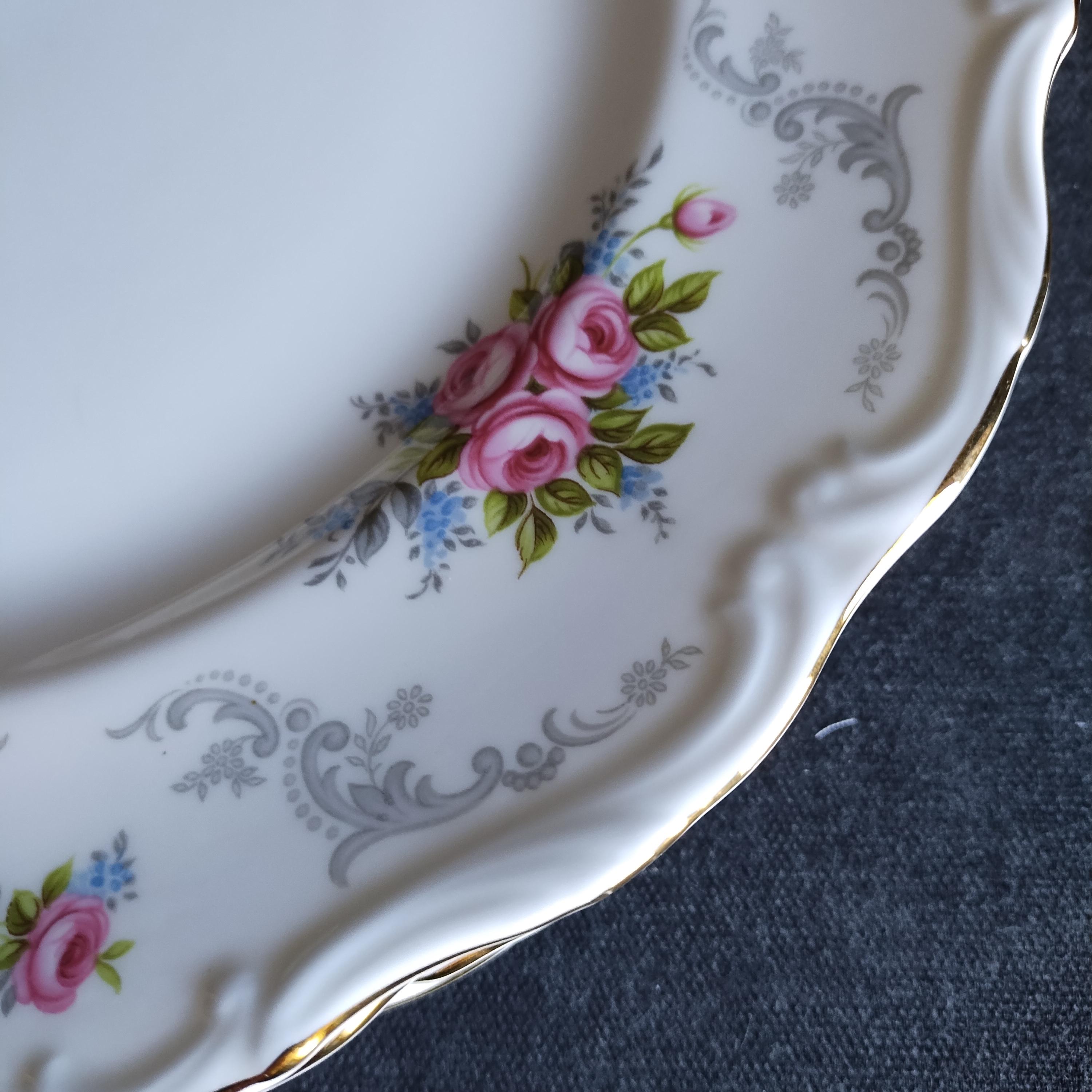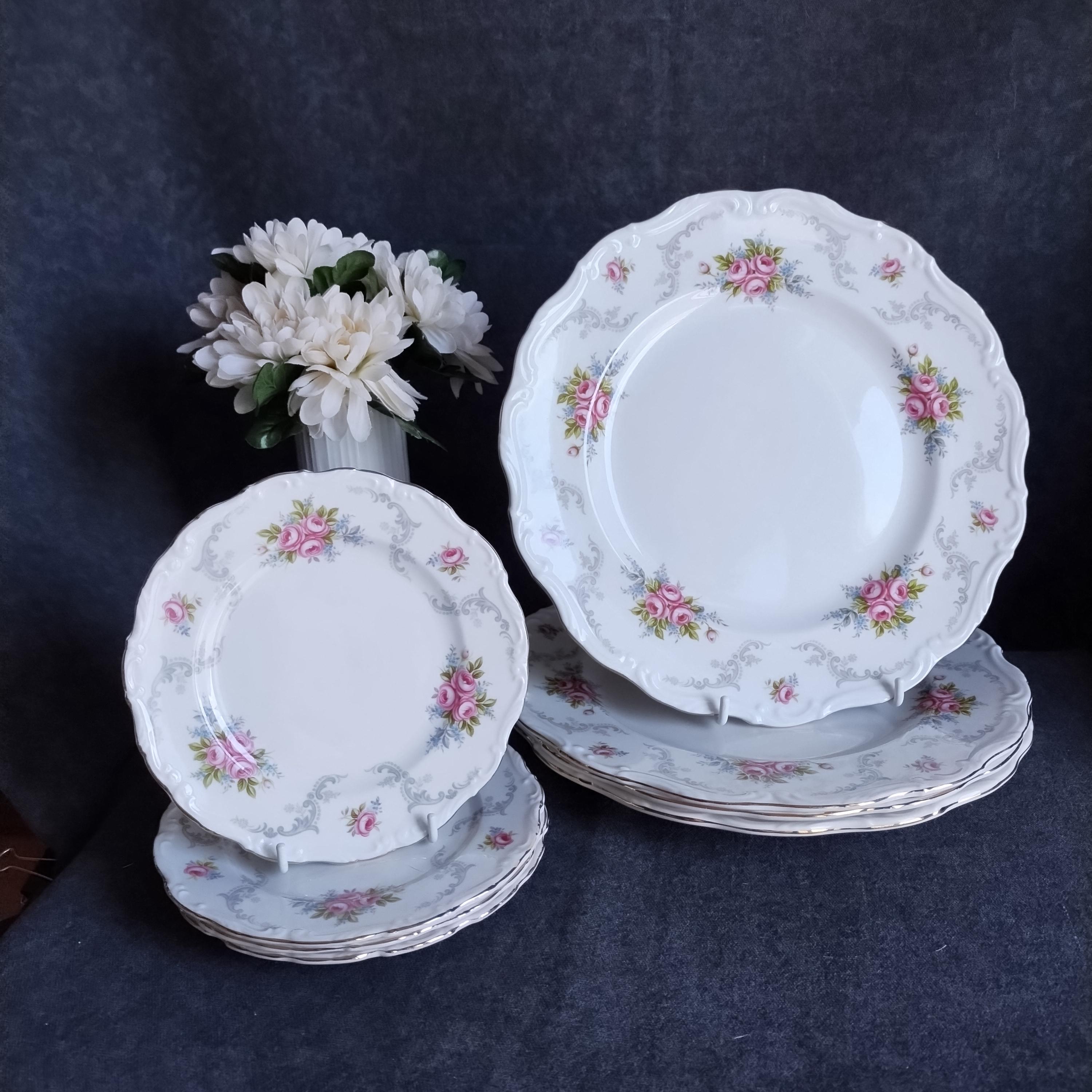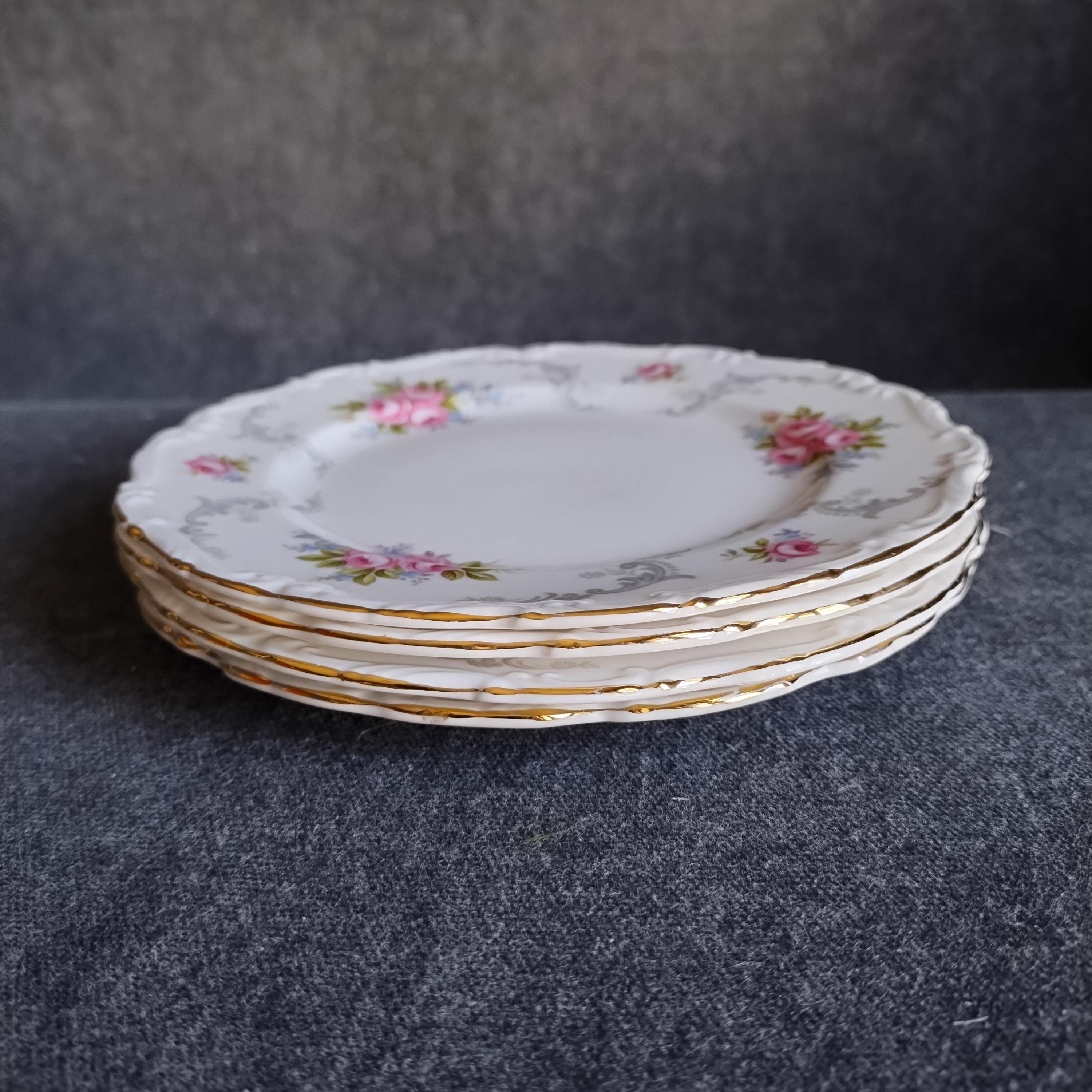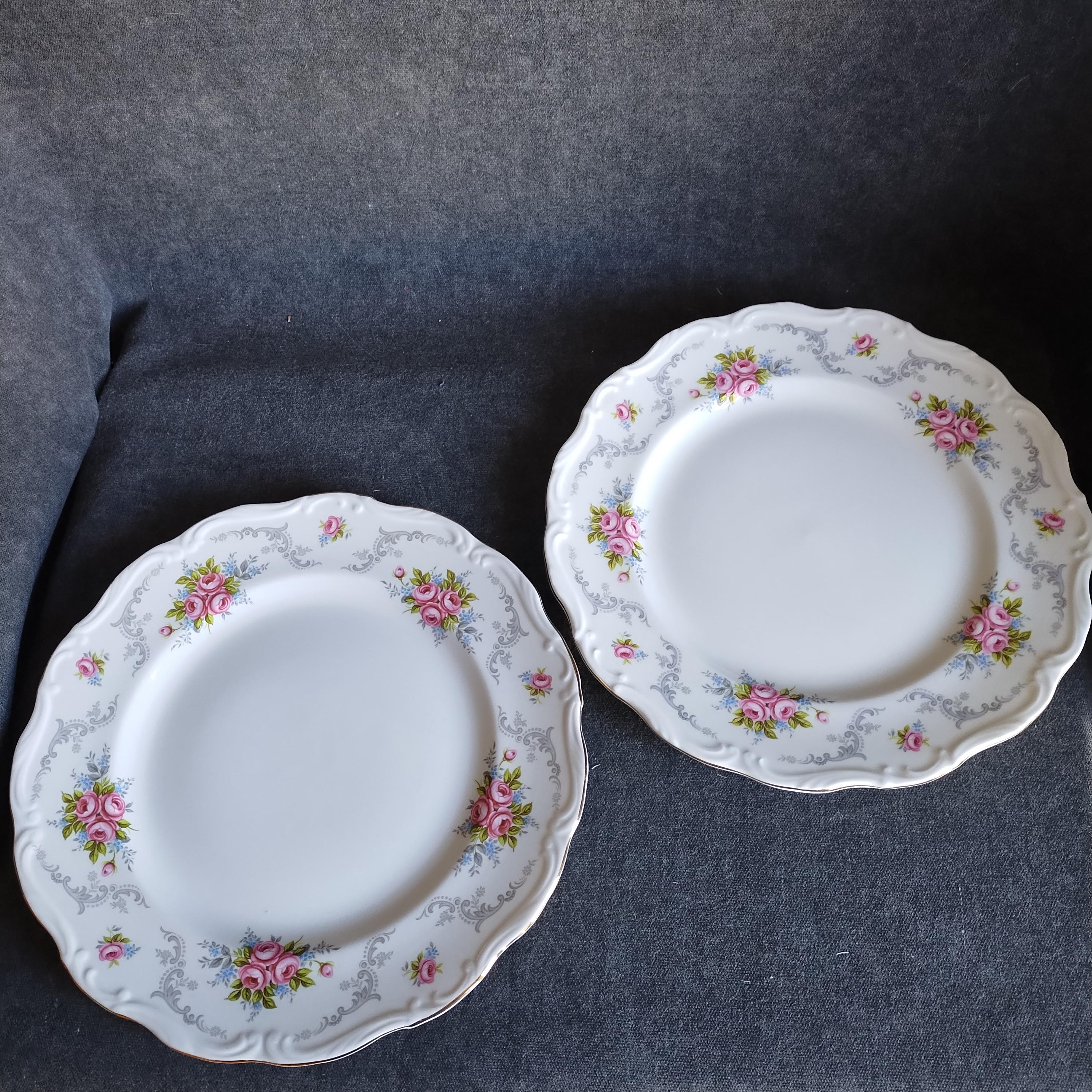 So pretty and delicate, these Royal Albert "Tranquillity" pattern plates will add a touch of class to any dining table. This bone china pattern features tiny clusters of pink roses accented with green leaves and blue sprays. The rims are adorned with light gray scrolls and have an embossed edge trimmed with gold. Tranquillity was produced from 1969-1998. Condition is excellent - no chips, cracks, repairs, or crazing. Minor surface wear consistant with age and very gentle use.